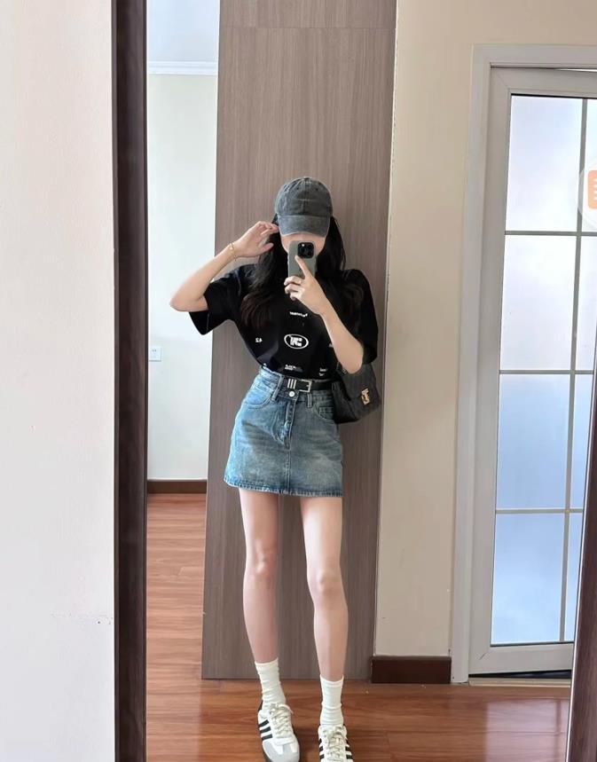 這一套實在是太喜歡了,整體穿搭的風格是又甜又酷,黑色短袖t恤配牛仔短裙,將青春少女範氣息打造出來了,t恤衫的下襬塞進裙子裏面,提高腰線又顯利落。搭配一雙德訓鞋,白色襪子外露出來,很好營造出層次感,又不失穿搭的細節。