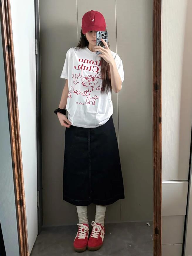 當然了,不喜歡把t恤束起來的也可以,那又是另外一種風格,就這麼隨意將t恤下襬放下,搭配深色中長款牛仔裙,多了幾分隨性無拘束感。整個穿搭唯一的亮點就是紅色棒球帽和紅色的運動鞋,輕鬆提亮整個穿搭。