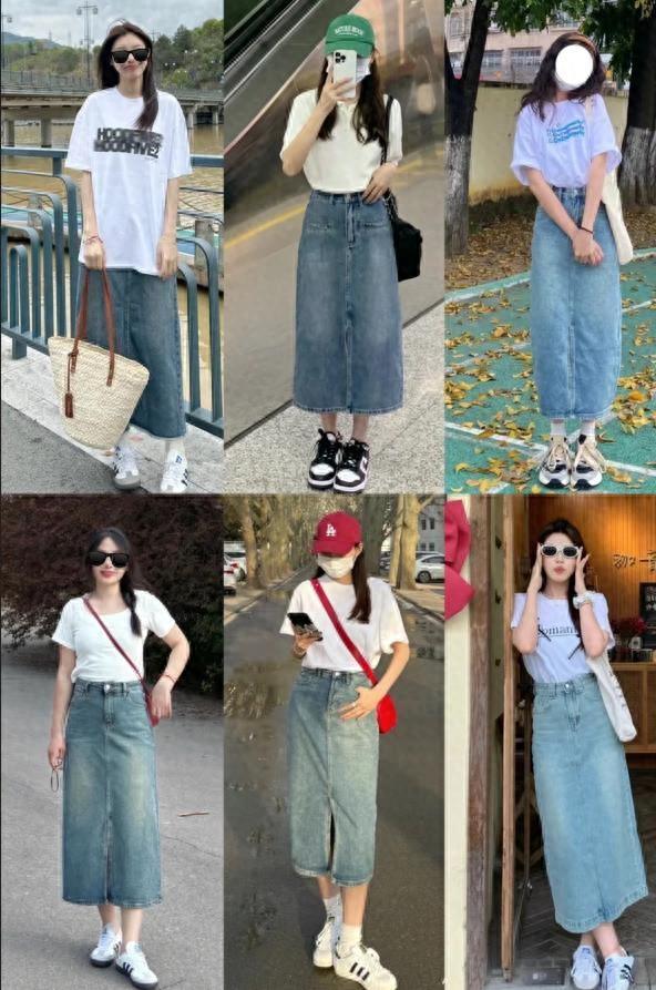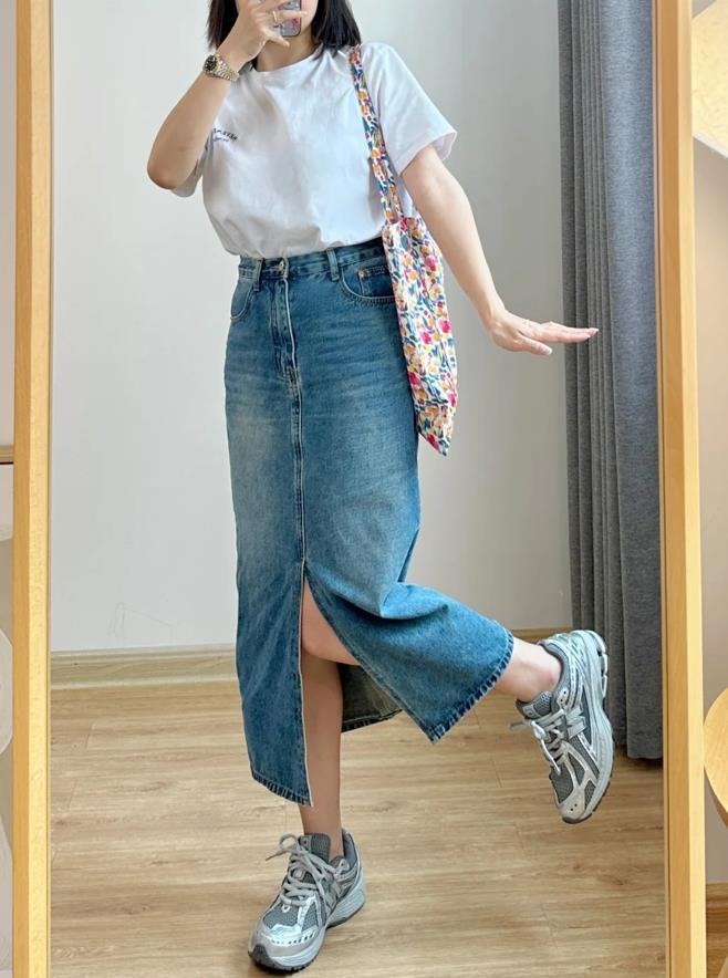 有時候,簡單一些的穿搭反而好看,就好比如夏天,就是應該從簡,白色的短袖t恤+中長款牛仔裙,裙襬處開衩的設計,既顯得很有細節感,又能將腿部線條拉長。T恤全部塞進裙子裏面,顯得又利落又顯高。