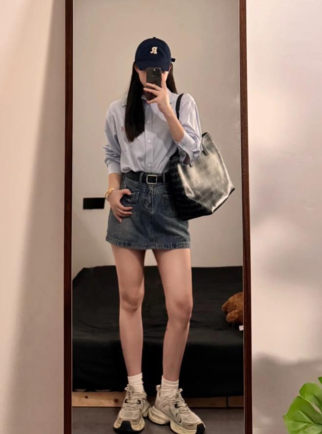 微胖的女生也可以大膽穿,這一套風格真的好韓啊,淺藍色條紋襯衫,這個色調最適合夏天了,自帶清爽和乾淨氣息,與深藍色牛仔短裙相配,再穿上一雙老爹運動鞋,休閒運動風就打造了,腰間增加了腰帶裝飾,把身材襯托得更纖細了。