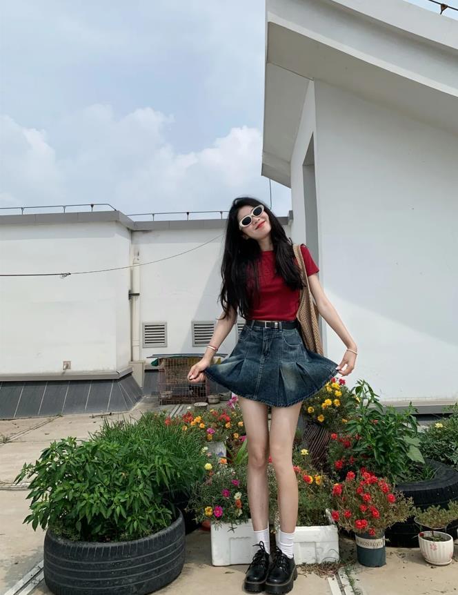 酒紅色配深藍色,這樣的配色也太搭了吧?夏天穿紅色系的單品會在視覺上給人一種炎熱感?不存在的!利用深藍色牛仔短裙來配就能化解這種情況,裙子腰間還配上一條黑色腰帶,修飾身材比例,還能將腿部線條拉長。腳下踩着一雙黑色厚底鞋,腿部的比例又被拉長了。