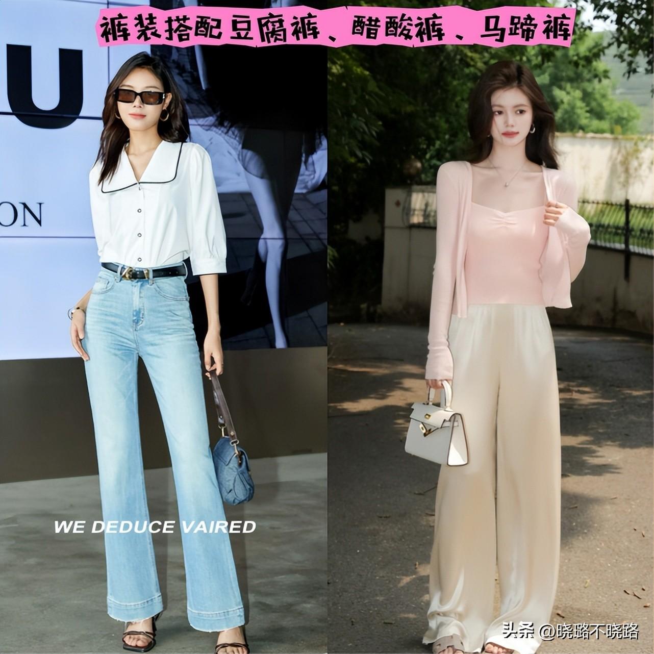 褲裝單品的搭配那自然就是考慮優選像自帶優雅溫柔的豆腐褲,白色系列的淺色調本身就有這方面氣質的襯托力。其次則是可以優化腿型狀態的高腰馬蹄褲,搭配低跟或者是高跟鞋的款式,彰顯女性的魅力。或者肉眼可見彰顯高級感的醋酸褲,適用於新中式的搭配呢!