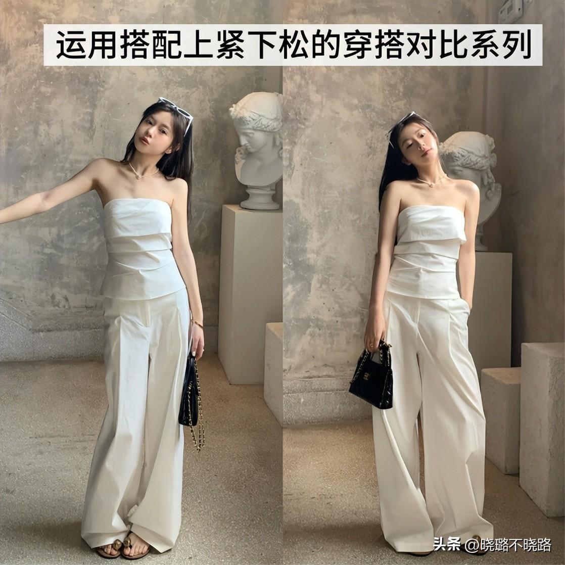 抹胸上衣的搭配它本身就是屬於比較偏向於緊身系列的穿搭,所以就在這裏提醒各位女性,其實我們可以多多的考慮搭配一些比較寬鬆型的下裝,與其進行組合的時候在視覺上是能夠非常明顯的強調出來上緊下松的這樣一個系列對比的,這對於梨形身材或者是腿型較爲粗壯,但是上半身比較纖細的女性而言真的是很好的搭配。