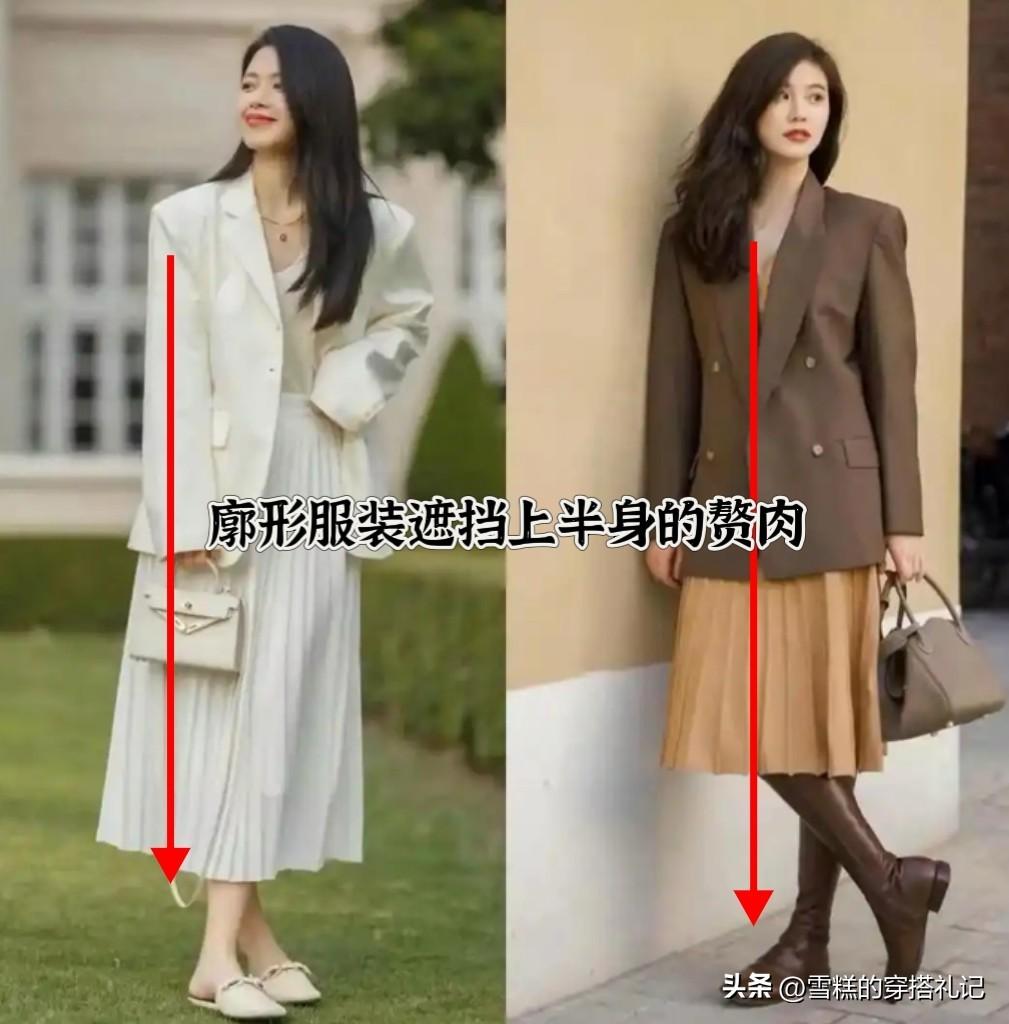 身材類型1、梨形身材——借用上窄下寬的搭配修飾肉肉