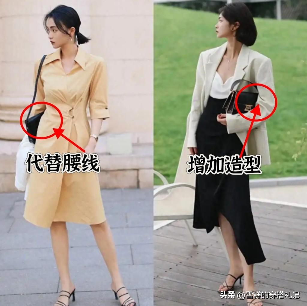 包包看起來很小,但是卻能夠發揮很強的作用。比如在穿連衣裙的時候。如果覺得腰身不是很突出,那麼完全可以考慮搭配一個精緻的小輪廓的斜挎包,此時有了鮮明的腰線後,讓你的身材瞬間窈窕了許多。而且小個子也憑藉精緻小巧的包包達到了分割比例的好效果。記住,如果服裝的顏色以黑色、灰色、白色這樣的基礎色爲主,那麼包包可以稍微亮一些,一樣能夠擁有很強的時尚感。