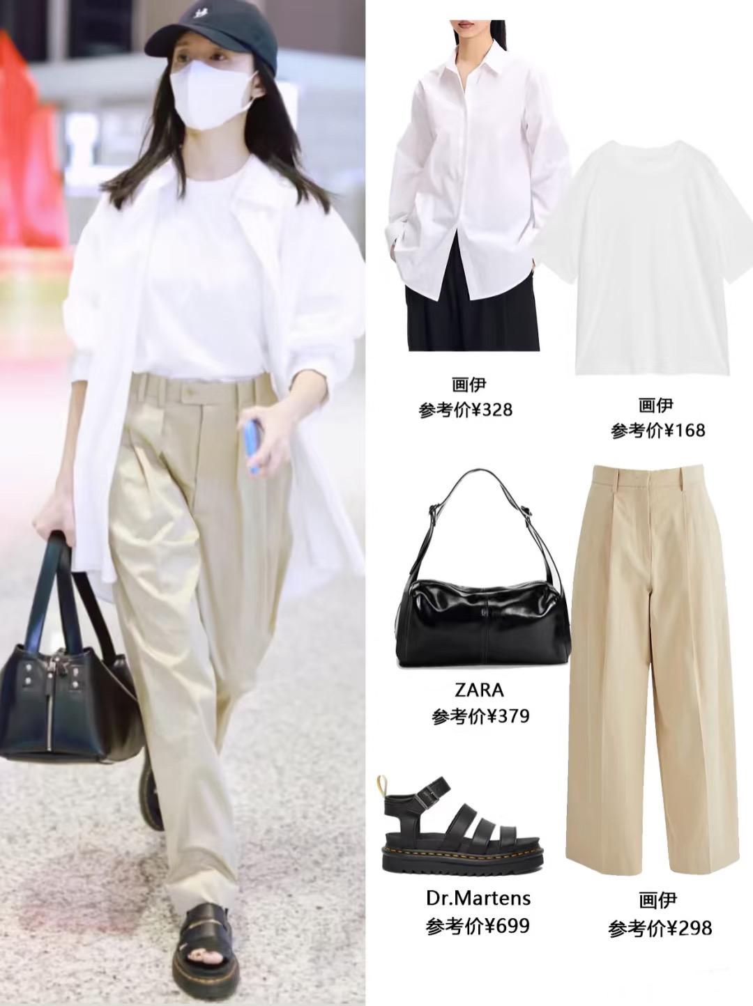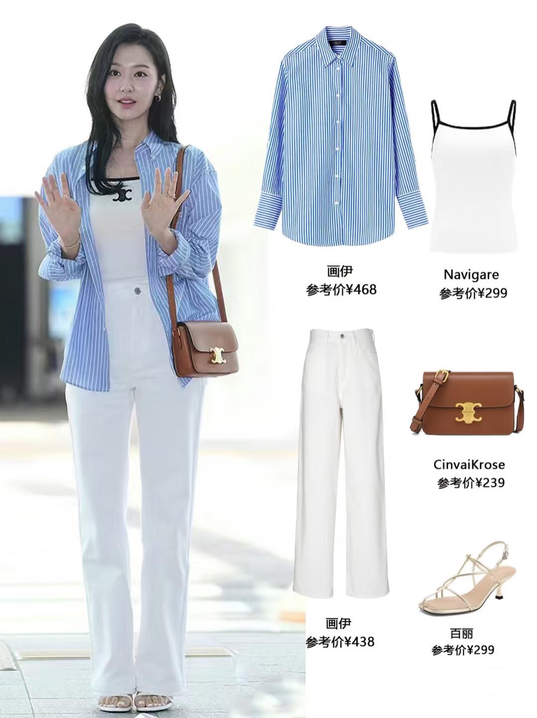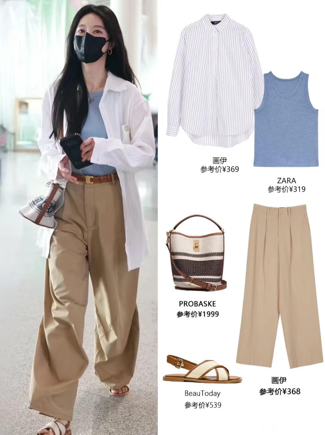 白色條紋襯衫、卡其色闊腿褲,修身的小背心,這組合有一種文藝範,很清爽、也減齡。寬鬆版型,適合高個子女生。