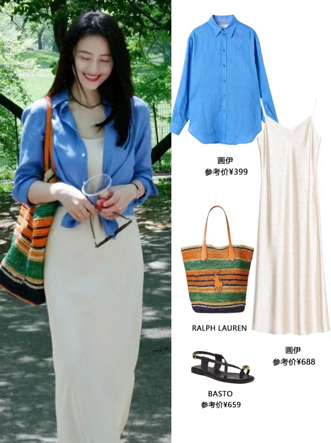 哪怕是短款的版型,也會顯著稍微寬鬆的剪裁。小短款的襯衫,與吊帶裙就很配。白色吊帶流暢細膩,與藍色襯衫完美融合,是優雅醒目的姿態。