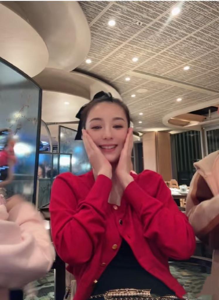 穿着紅衣黑裙的方媛,用雙手捂着臉,笑得一臉慈愛,就像是孕期媽媽溫柔的模樣。而且寬鬆的小黑裙,都蓋不住微微隆起的小肚子,她彷彿真的是有“孕肚”了。