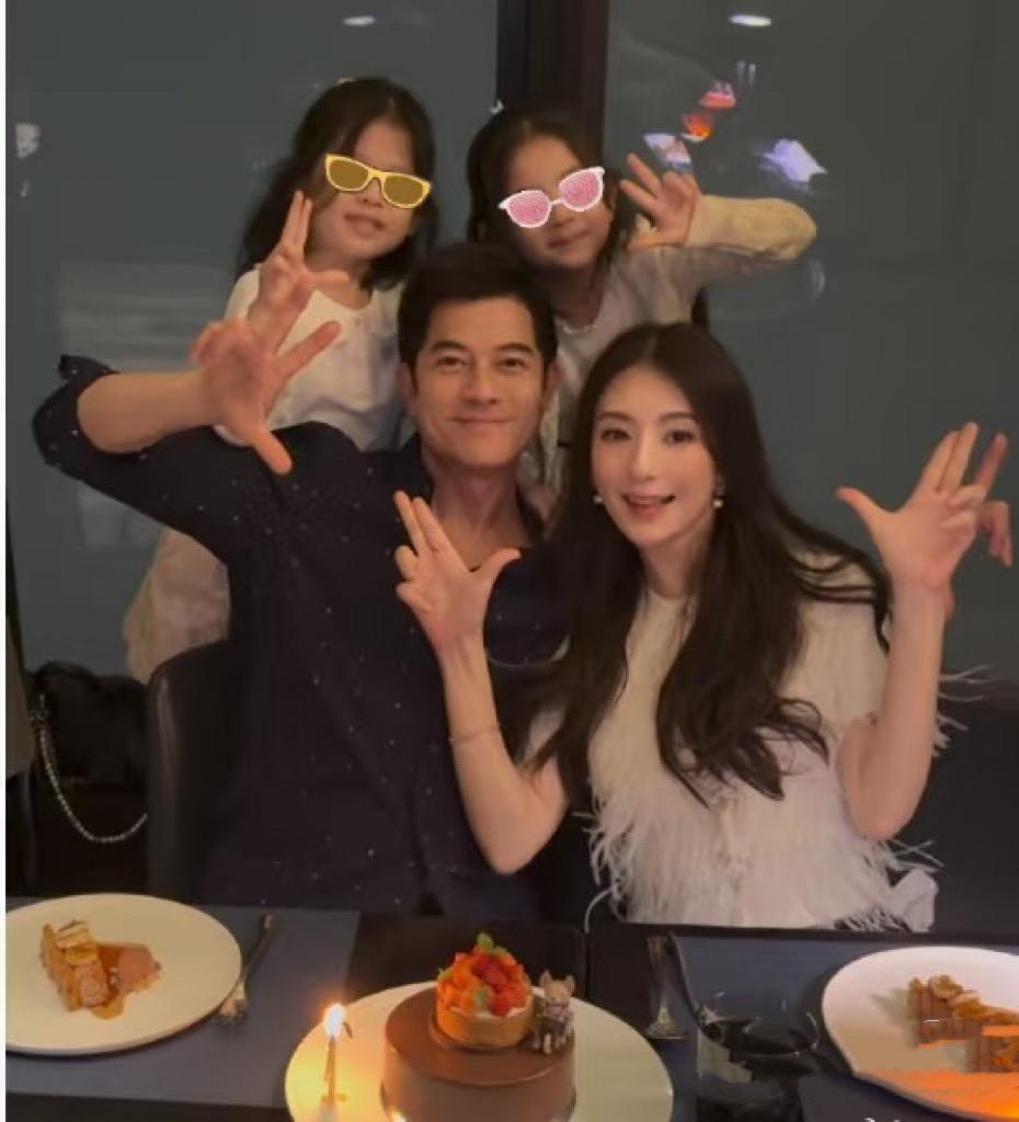 節假日的時候,一家四口會一起慶祝,他們對着鏡頭比八字表情,一家人都笑得很甜。而且郭富城特別注重孩子的隱私,每次兩個女兒出現在合影裏,都會給女兒打碼。
