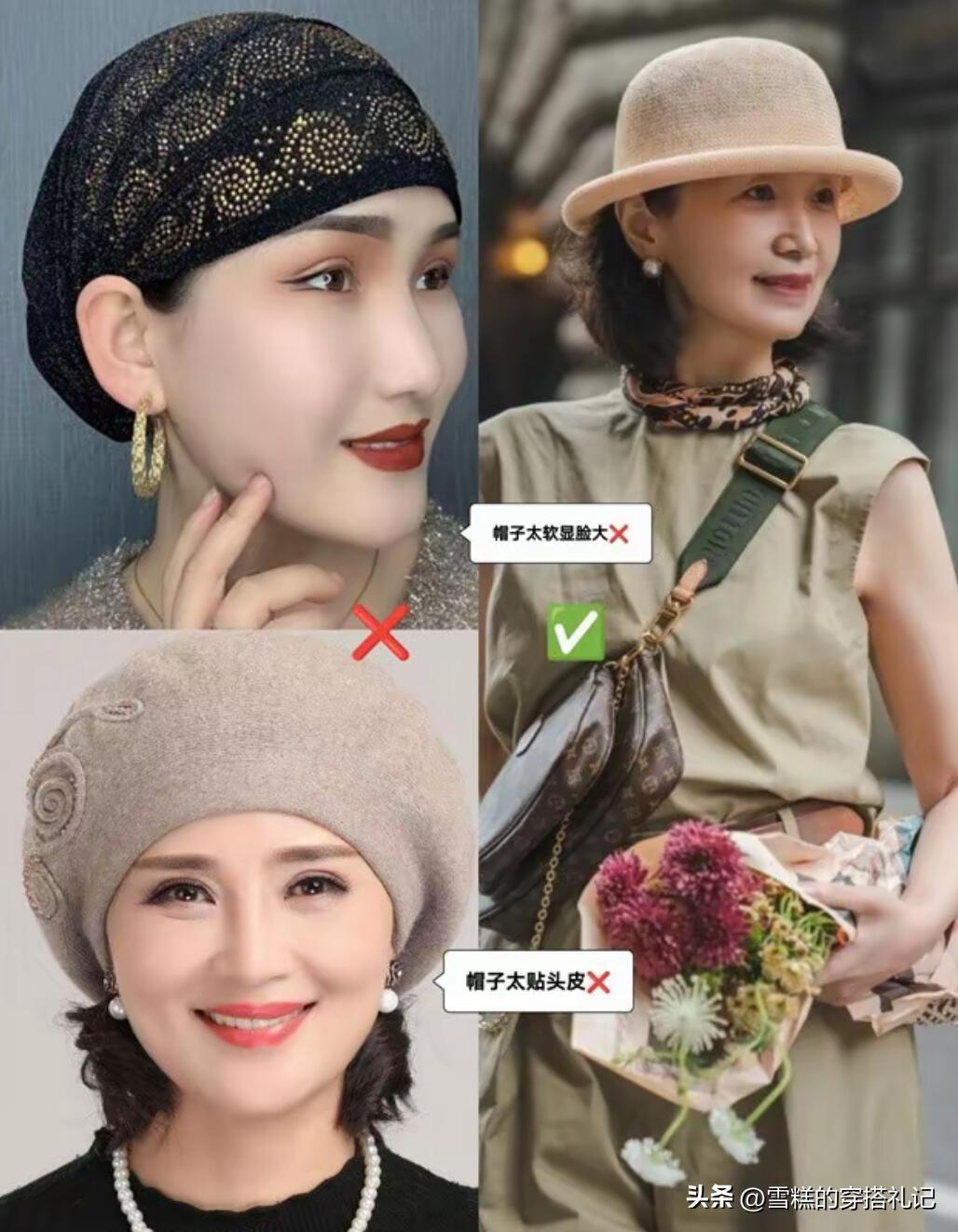 無論是30歲左右的成熟女性,亦或者是60歲左右的優雅女性,挑選帽子都要避開暗沉色,黑色清爽乾淨一點,反而可以更好地襯托膚色,並且還具備減齡的功效。