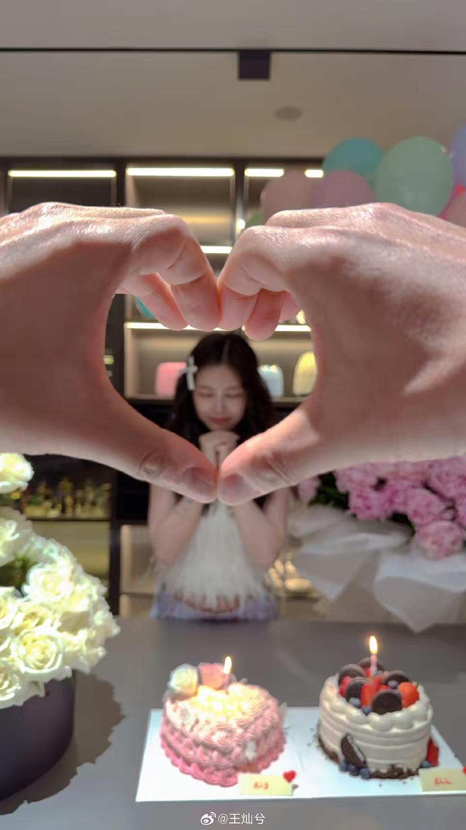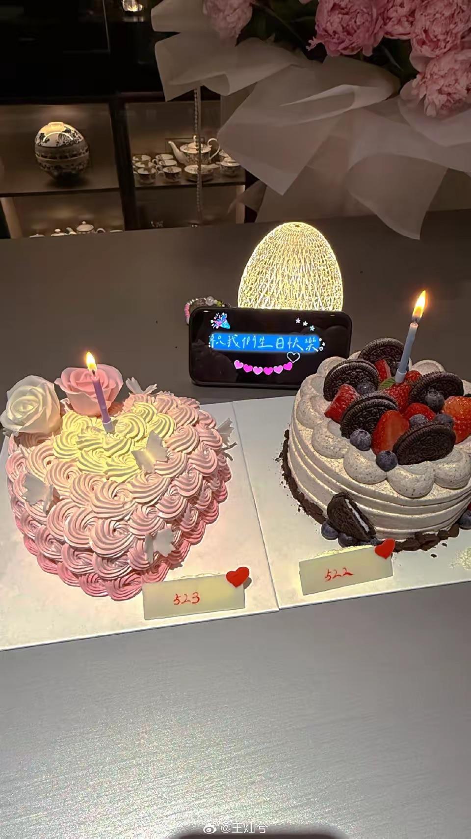 因爲是兩個人過生日,所以特意準備了兩隻蛋糕。一隻是巧克力蛋糕,像是給杜淳選的,另一隻粉紅色的愛心蛋糕,像是王燦選的。