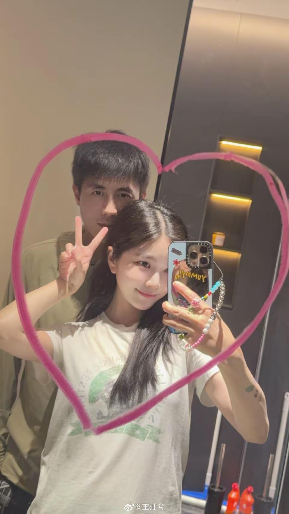 這個背景,一看就是王燦家裏的衛生間。他們穿着寬鬆的T恤,隨着鏡子自拍。王燦的臉又白又小,非常有辨識度。