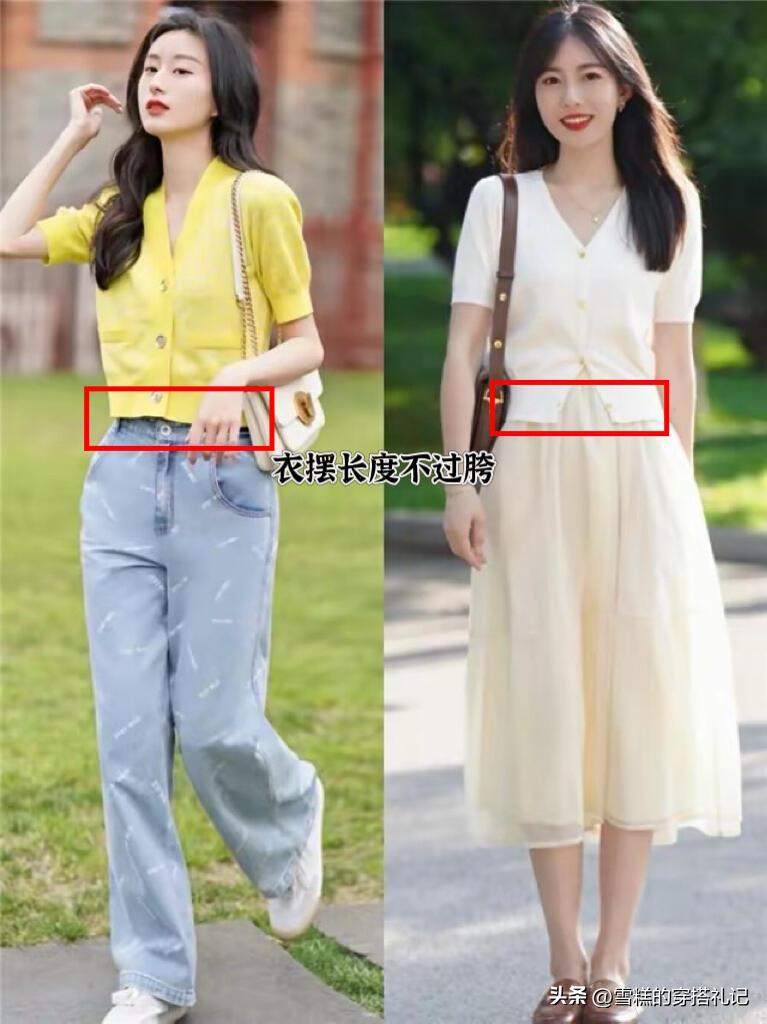 搭配短款奶奶衫的時候,下裝要選擇高腰線,腰線太低不僅顯腿短,穿在身上還不夠得體,高腰線款式的長褲、長裙,即便是搭配平底鞋,也沒有壓個子的風險。