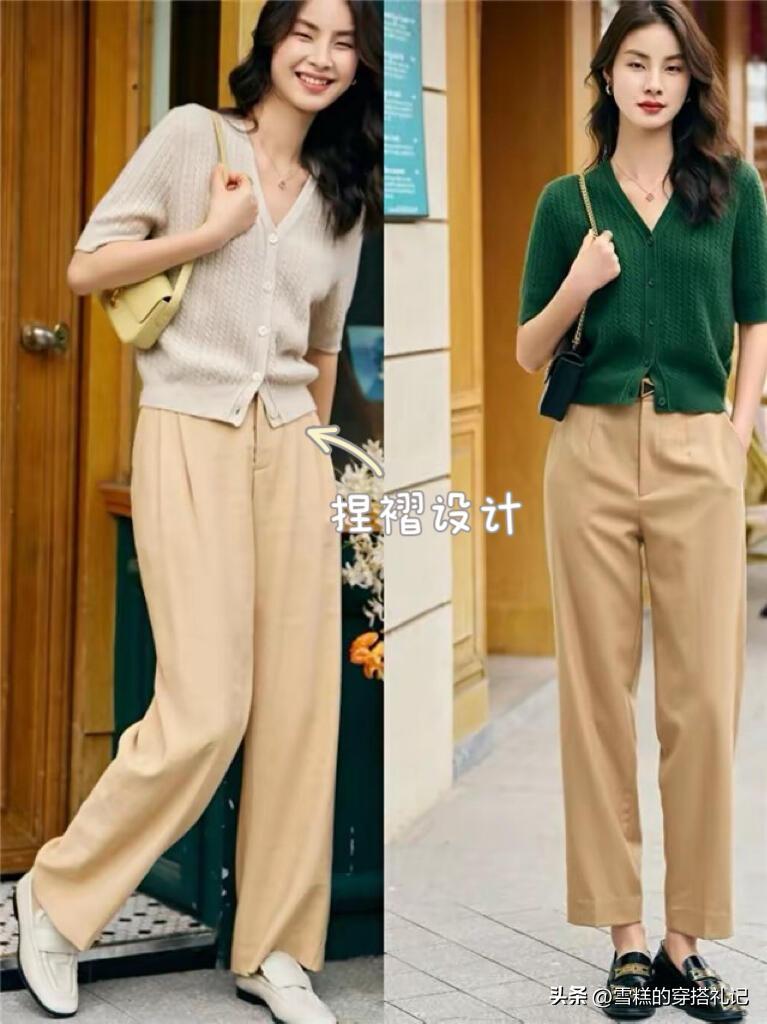 看了奶奶衫的搭配,終於知道爲什麼T恤會被替代了,一件V領款式的短袖針織衫,搭配卡其色捏褶西裝褲,不僅沒有中規中矩的感覺,甚至還穿出了幹練利落的效果,氣場更是撲面而來!