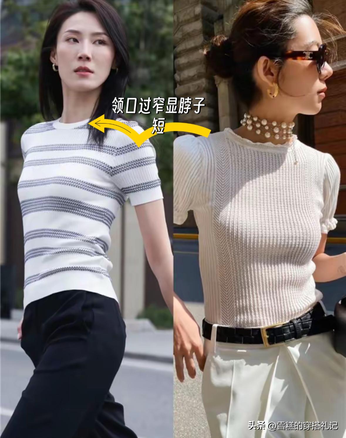 穿衣打扮的前提是足夠舒適,在挑選奶奶衫的時候,如果領口太窄的話,就很容易累得喘不過氣,而且視覺上會顯得脖子特別短,尤其是窄圓領,很容易拉寬肩部,使上半身更壯。