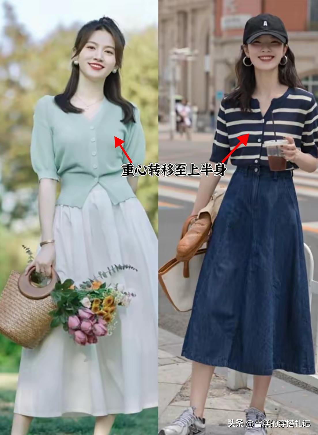 奶奶衫和傘裙的組合,儘量可以將重心轉移到上半身,選擇淺亮色系的奶奶衫,或者是加入條紋元素,都可以輕鬆凝聚視線。