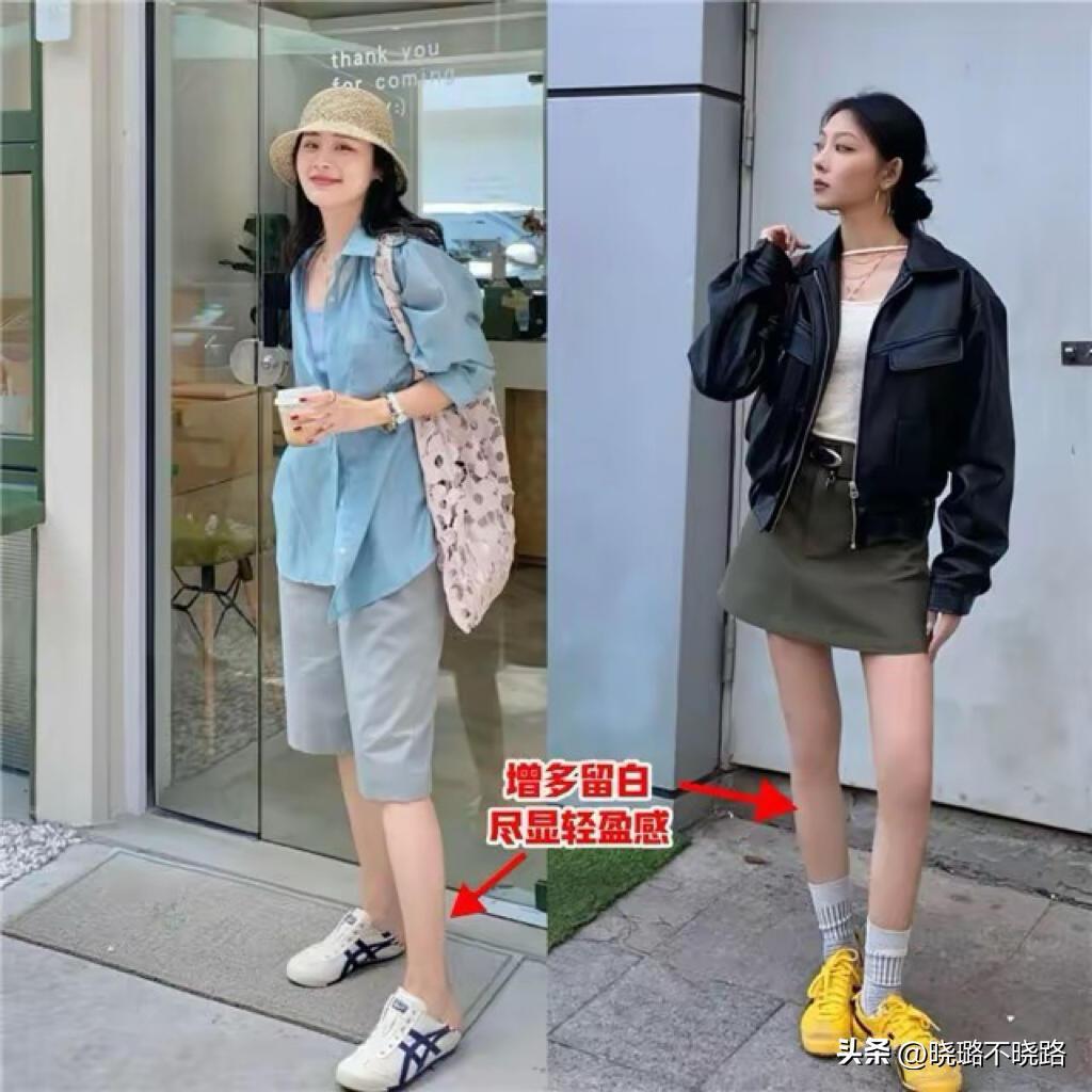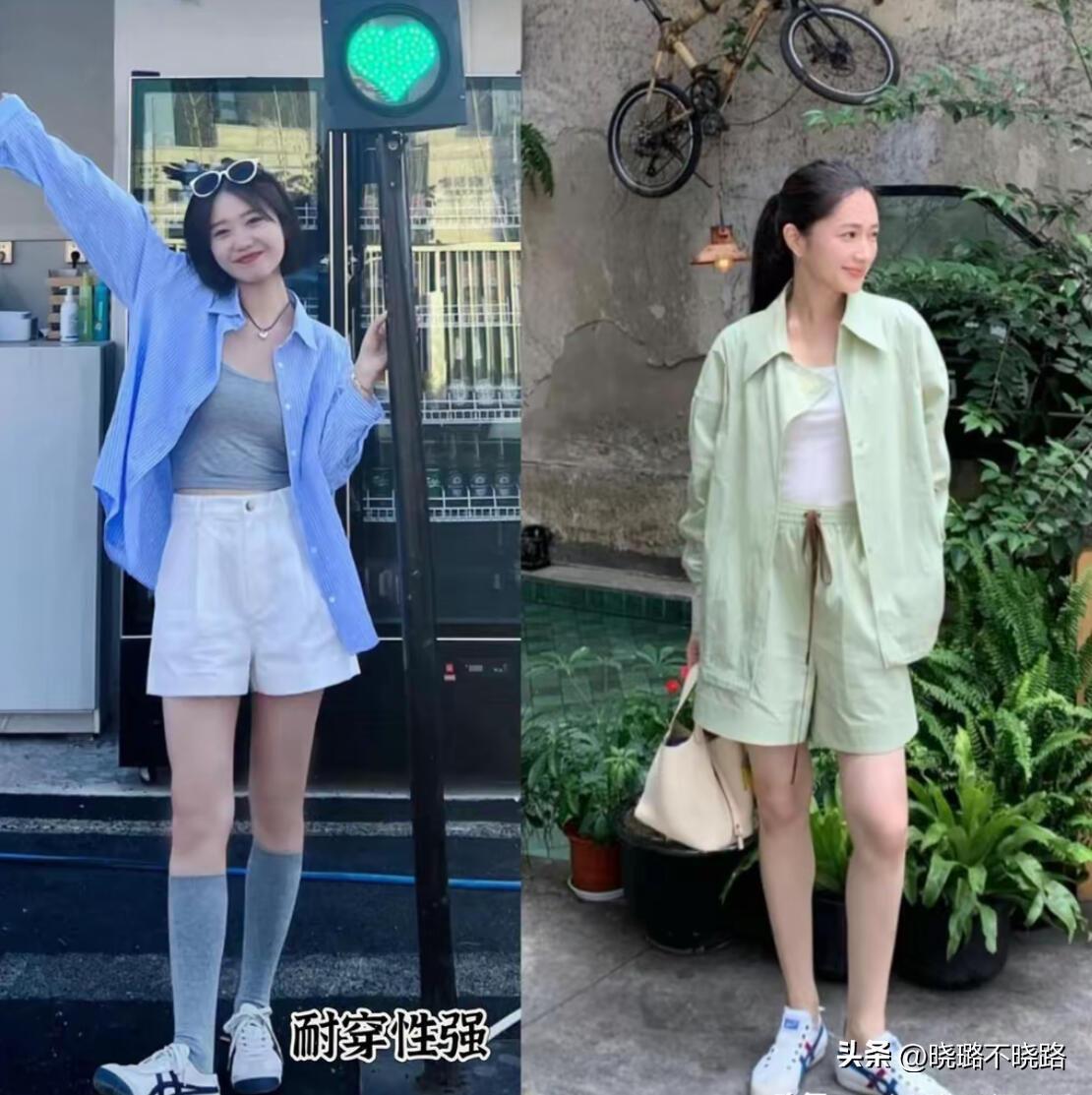 對於雙腿線條比較纖細的姐妹來說,穿鬼塚虎鞋就要增多下半身的留白麪積,所以下裝可以選擇短褲短裙,在搭配上一雙鬼塚虎,竟然秀出美腿,還能彰顯輕盈感。