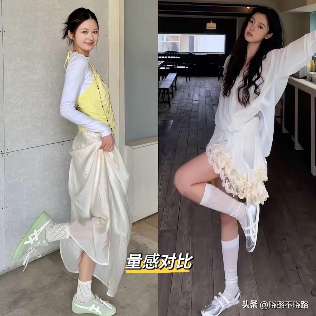 在搭配小量感的鬼塚虎時,下裝的量感就要放大一些,可以選擇闊擺設計的長裙,亦或者拖地長褲的闊腿褲,和鞋子形成“量感對比”,在視覺上顯瘦又顯高。