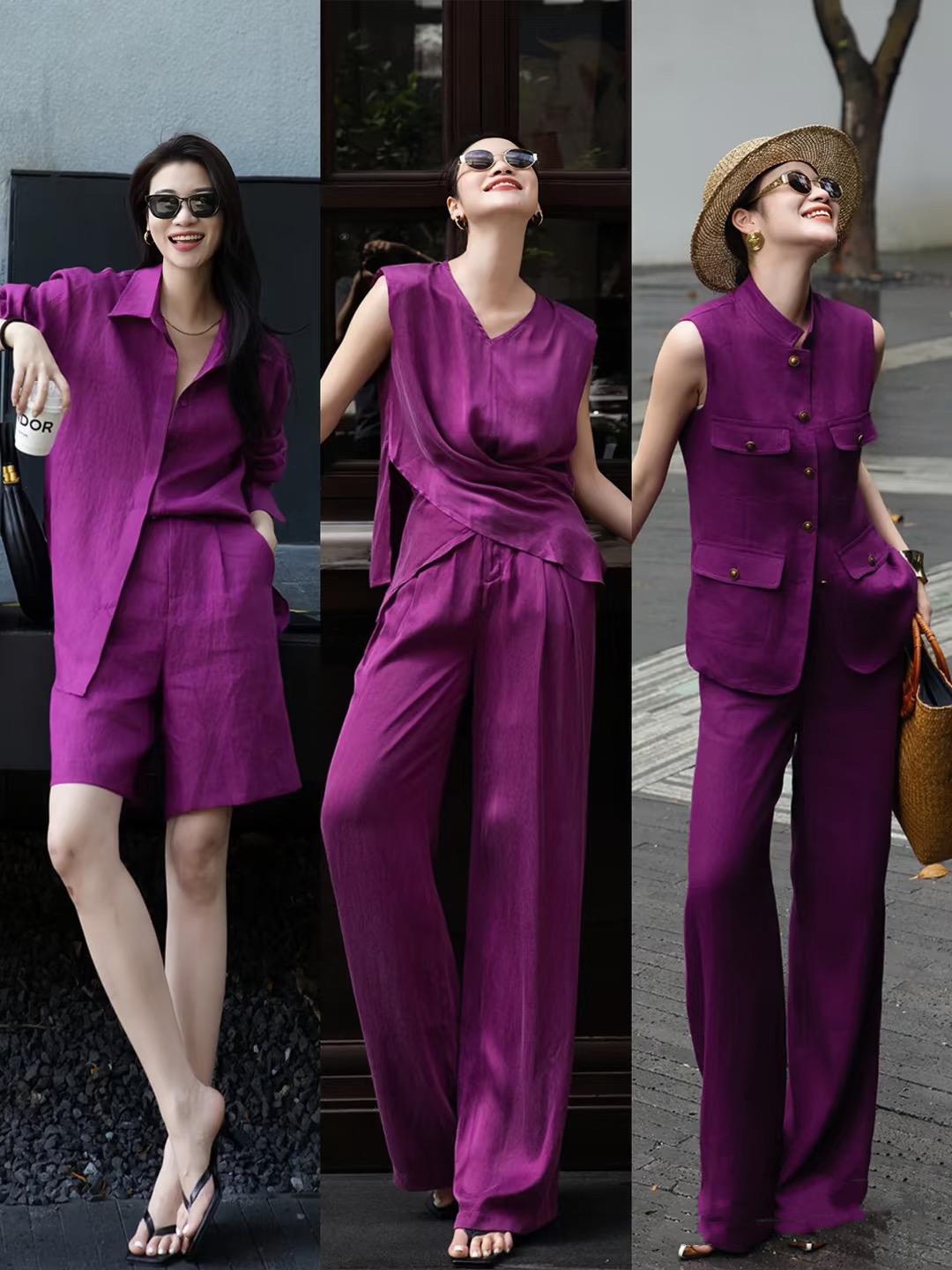 尤其是紫色的套裝,選擇稍微寬鬆的版型,給人一種很高級、很舒適的美。