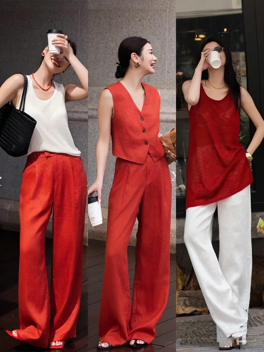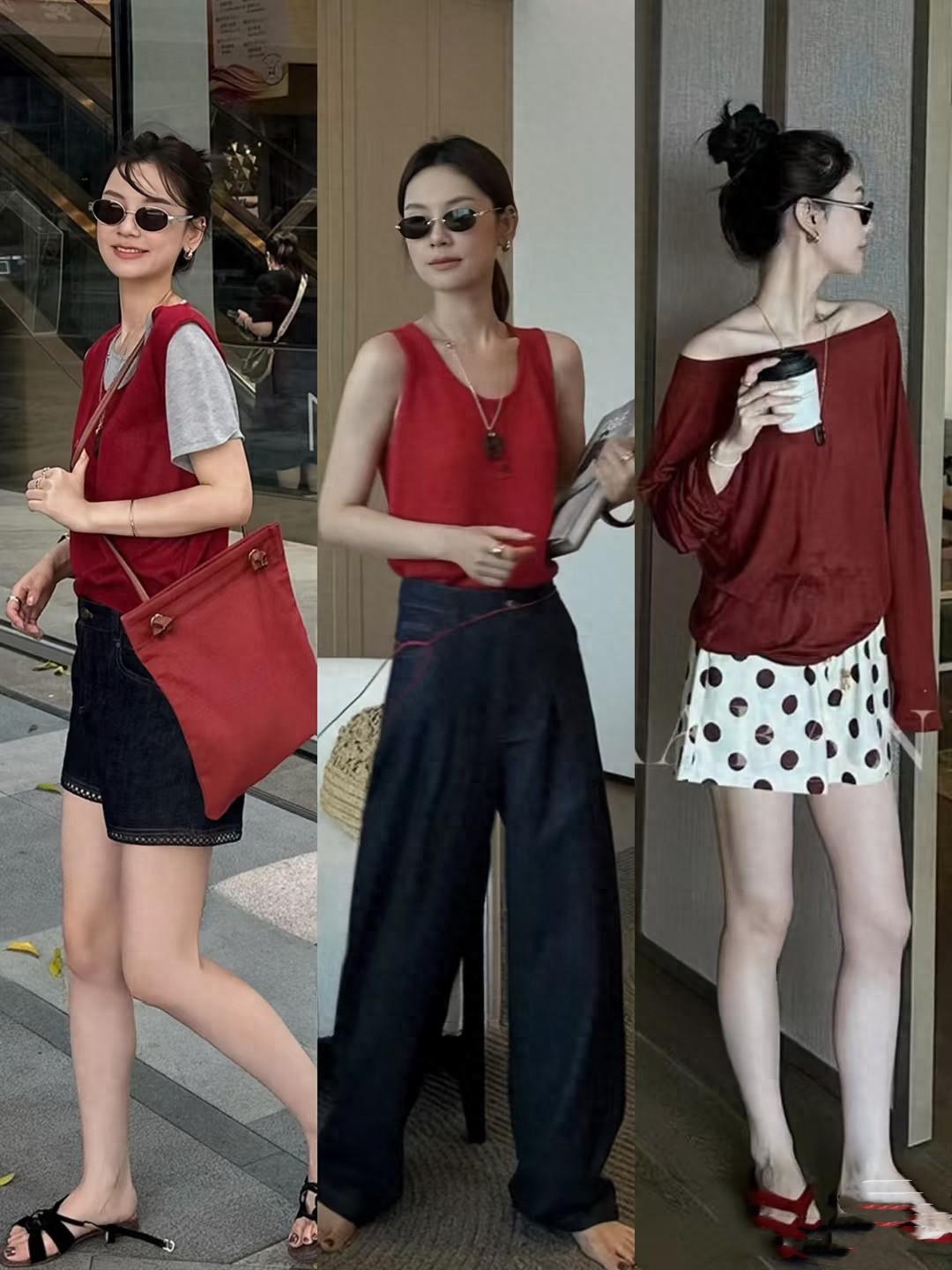 紅色的小背心、馬甲、T恤、一字肩上衣,都比較適合骨感纖薄的女生。適當的輕盈和露膚,表現着更輕盈的自在。