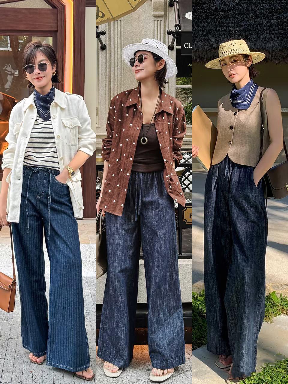 如果不知道選什麼,藍色的牛仔褲就很合時宜。尤其是面料柔軟的藍色闊腿牛仔褲,簡單大方、配高跟鞋好顯腿長。