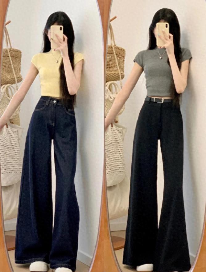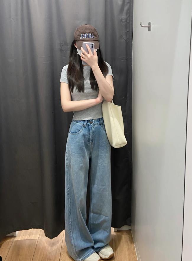 今年夏天流行的闊腿褲,又怎能沒有牛仔闊腿褲呢?經典百搭的款式,無論你怎麼去搭配都不容易出錯,寬度版型適中,既能遮掩腿粗的缺點,又不會顯得太拖沓,搭配一件短款正肩短袖t恤,上短下長的搭配真的yyds,而且這樣穿好顯腿長啊。