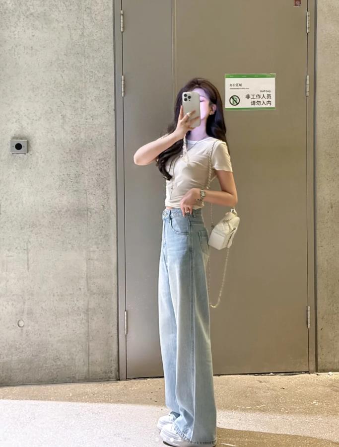 小腿粗、腿不直的梨形身材,真的太適合穿闊腿褲了,淺藍色牛仔闊腿褲,很清爽乾淨的顏色,非常適合悶熱的夏天,上衣搭配一件純白色的短袖t恤,上短下長的組合,既優化了身材比例,又好看,小個子女生不出錯的穿搭法則。