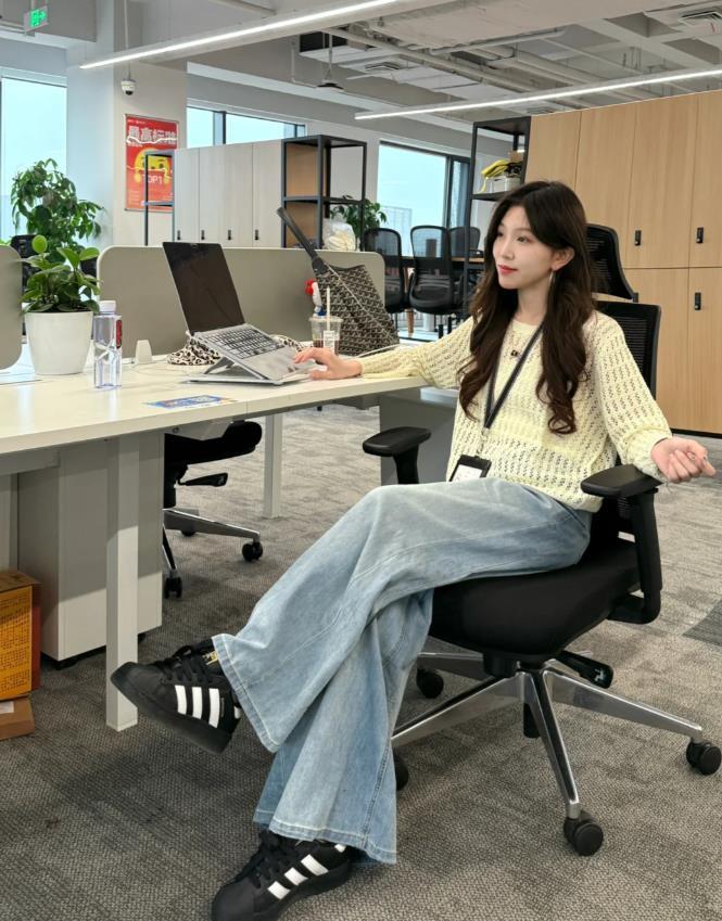 這是一套簡約主義的look,喜歡這種風格的姐妹可以參考下,鏤空罩衫+淺色牛仔闊腿褲,慵懶味道十足,時髦的打工人穿搭,罩衫的顏色是淺淺的奶黃,可以讓你看起來很溫柔氣質,搭配一雙黑色運動鞋,這樣顯得很休閒舒適,輕鬆自在。