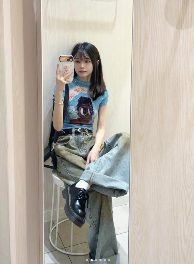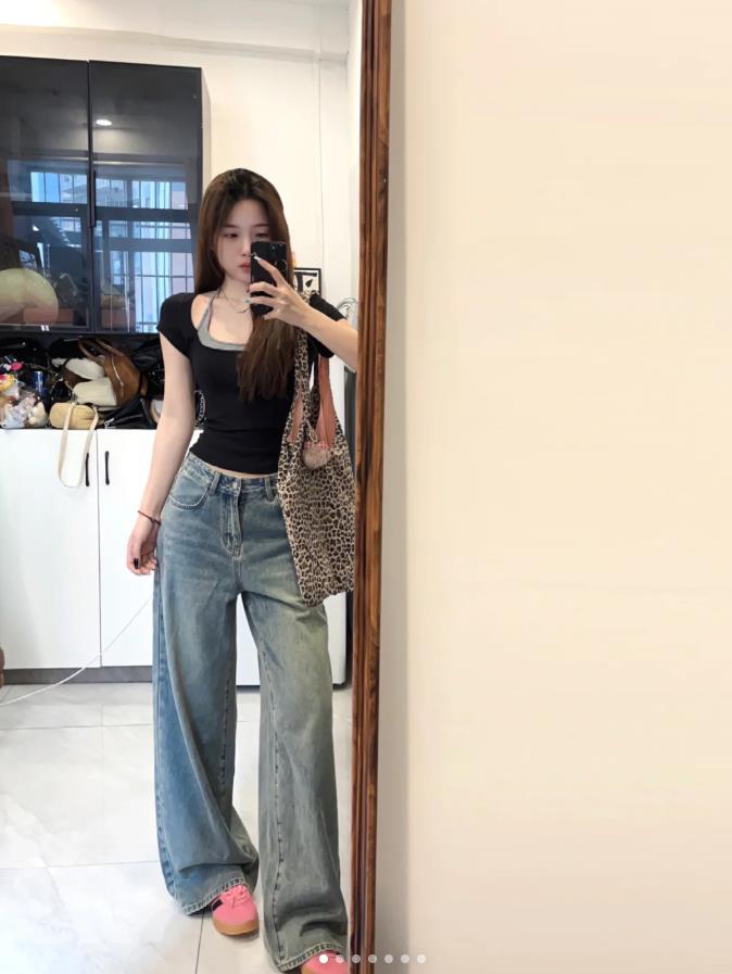 修身t+牛仔闊腿褲,這條褲子的版型真的絕了,穿搭的風格是簡約大氣風格,上短下長的穿法,簡直是小個子的天花板搭配,褲子有些拖地也沒有關係,因爲這能恰到好處拉長腿部線條,腳上穿上一雙粉色運動鞋,很好增加甜美範。
