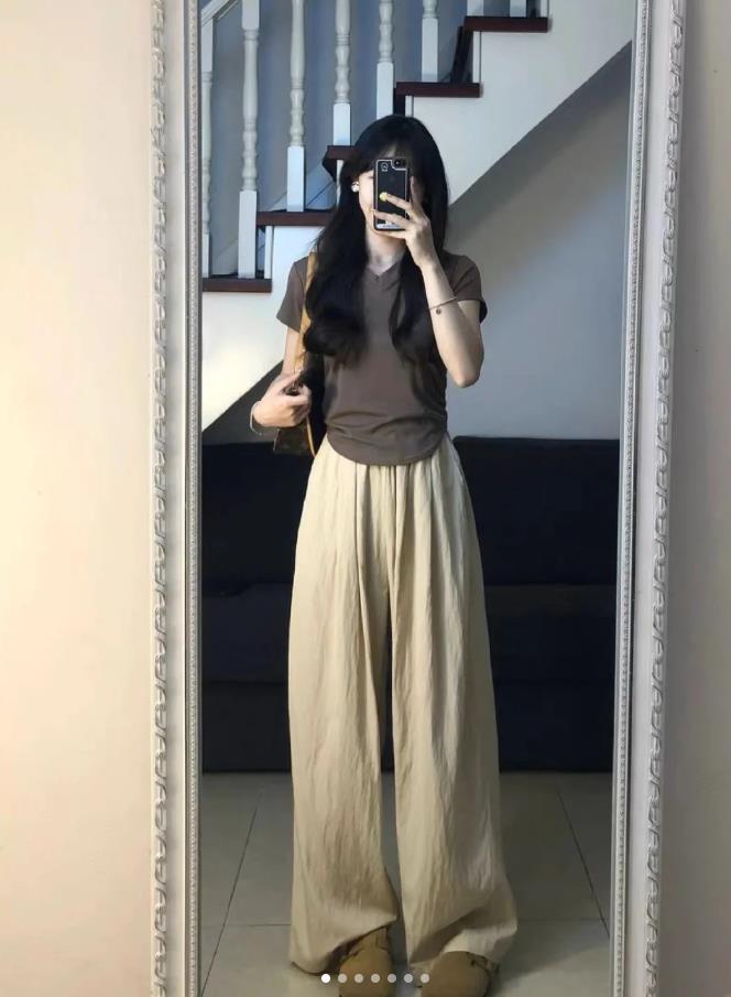 悶熱的夏天,最適合穿這種冰絲材質的闊腿褲了,帶點皺褶感的款式,不僅摸起來舒服,上身更是能很好遮掩腿部的肉肉,搭配的話,簡簡單單就很好看了,寬鬆的版型可顯瘦遮肉了,拯救各種不完美的腿型,高腰的設計,能輕鬆拉長腿部線條。