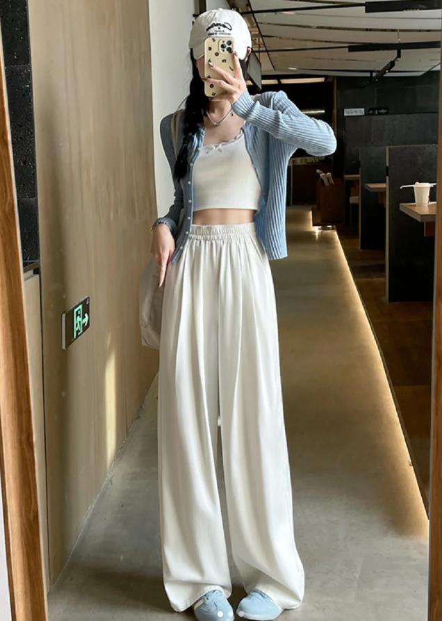 這簡直是梨形身材的天花板,誰懂啊,闊腿褲就是梨形身材和腿粗星人的救星,白色垂墜感闊腿褲+白色短款吊帶,外面還疊穿了一件淺藍色針織開衫,整個穿搭給人的感覺清新又溫柔,利用白色棒球帽和淺藍色運動鞋與之呼應,出街回頭率超高的。
