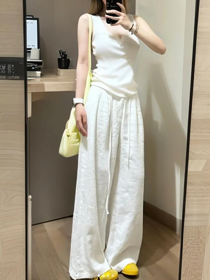 這個夏天,說什麼也要爲自己入手一條冰絲闊腿褲,這個材質的舒適度很佳,透氣性也非常好,寬度適中的版型,很藏肉顯瘦。垂墜感也非常不錯,所以穿起來後能很好把腿部線條給拉長,上衣一件小背心+防曬衫,簡簡單單的好看。