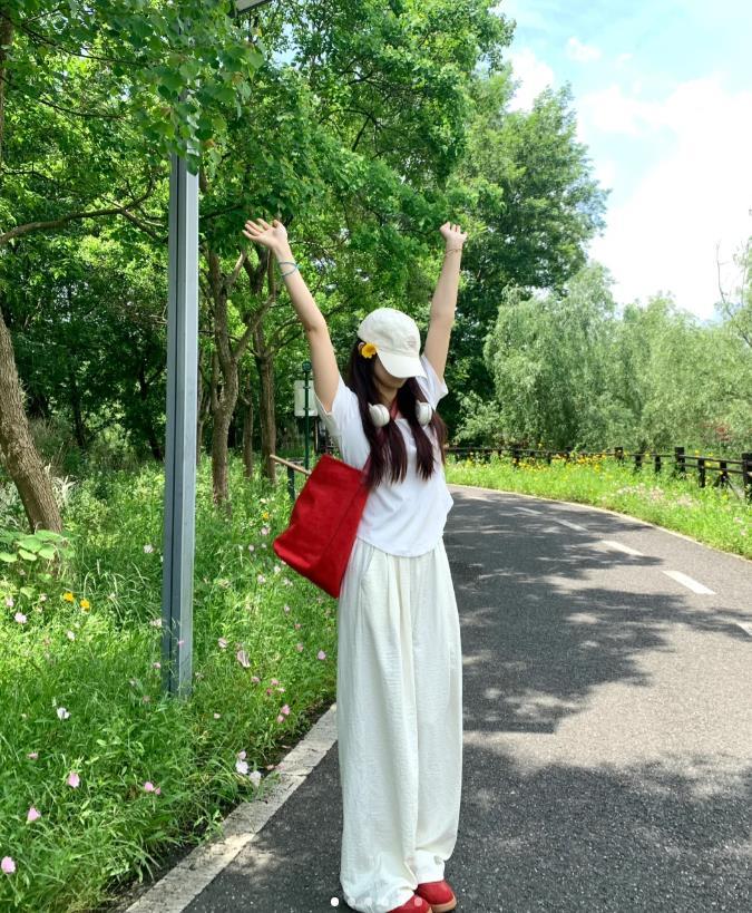 沒有一條白褲子怎能過夏天呢?一身白色可太耐看好穿了,褲子的面料是冰冰涼涼的,面料垂感十足,真的太喜歡了。關鍵是穿起來很顯腿長,紅色的挎包和鞋子進行了呼應,也對整個裝扮進行了點綴,這麼出街回頭率也很高,輕鬆自在舒服。
