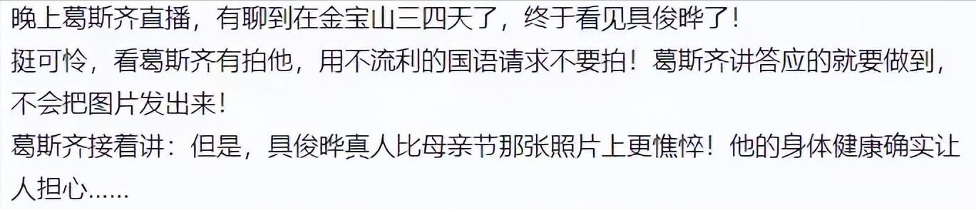 葛斯奇也同意了具俊曄的要求,在直播間只表述了自己在金寶山看到了具俊曄,沒有放照片。而在葛斯奇的描述裏,具俊曄也是個可憐人。