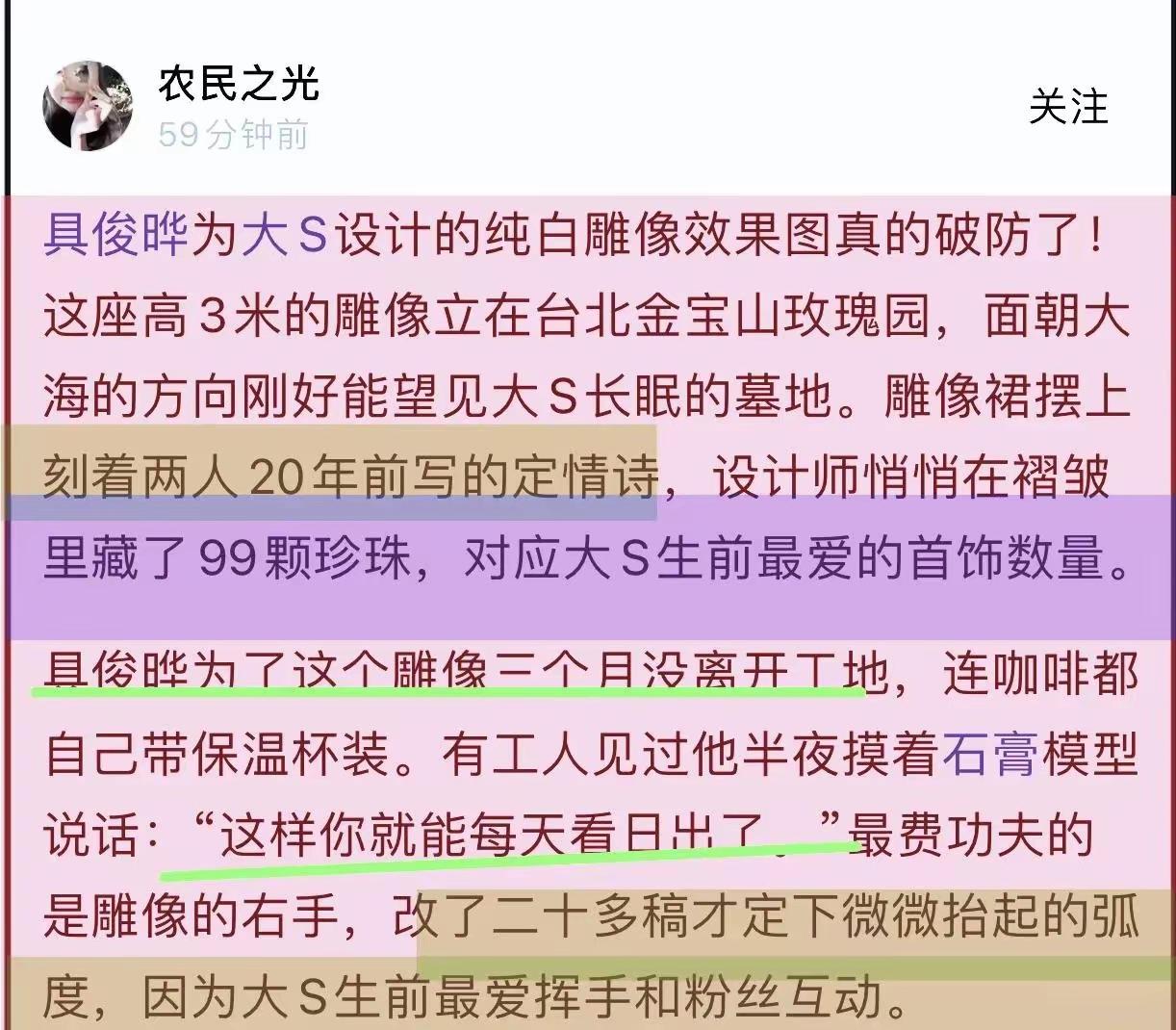 但是具俊曄什麼都沒說,他不像S媽和小S一樣,在網絡上消費大S。他唯一做的事情,就是一張一張的畫大S的雕像,然後一天一天的去墓地陪着大S。