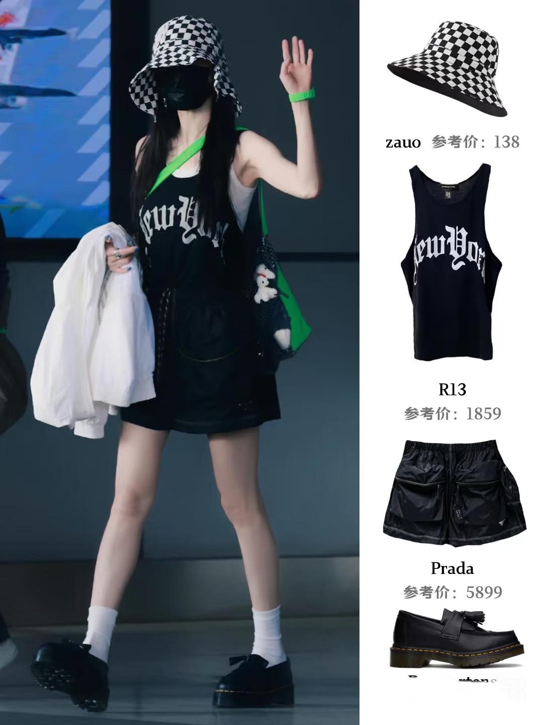 寬鬆的黑色籃球背心,配上黑色超短褲,再穿一雙黑色厚底鞋,將少女的活潑和輕盈完美呈現。尤其是千鳥格的漁夫帽,遮陽還顯臉小,太值得大家借鑑了。