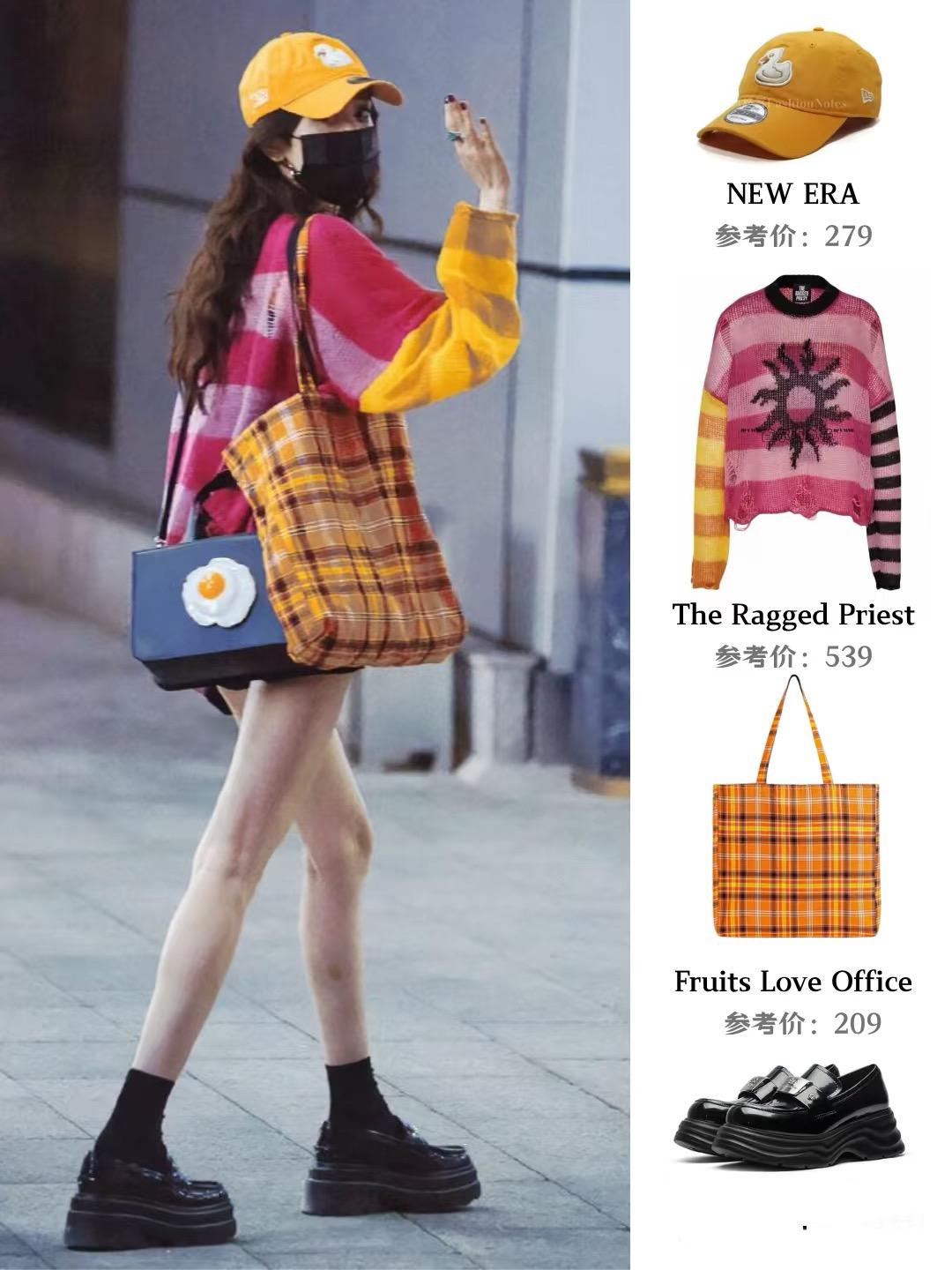 楊冪戴一頂橘色遮陽帽,穿着不對稱的條紋上衣,自由的玩着下衣失蹤。尤其是包包上的煎蛋圖案,也太可愛了吧。