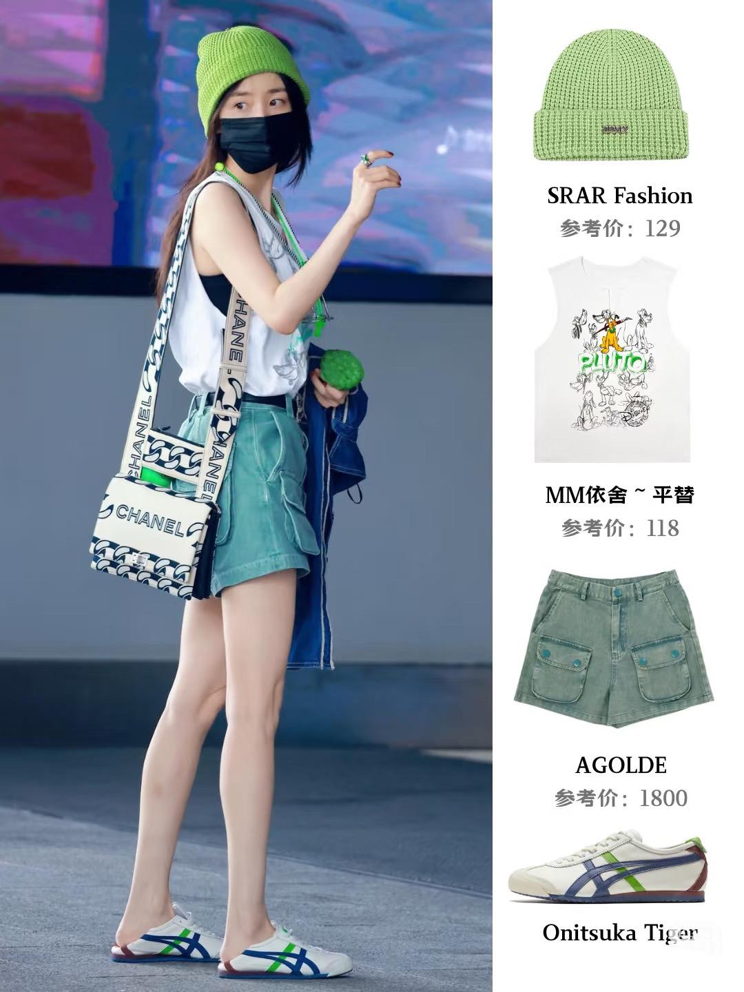寬鬆的卡通印花背心,內搭是黑色小背心,在臂彎處呈現出清晰層次。配上覆古綠色的短褲,休閒又減齡,大長腿更醒目。