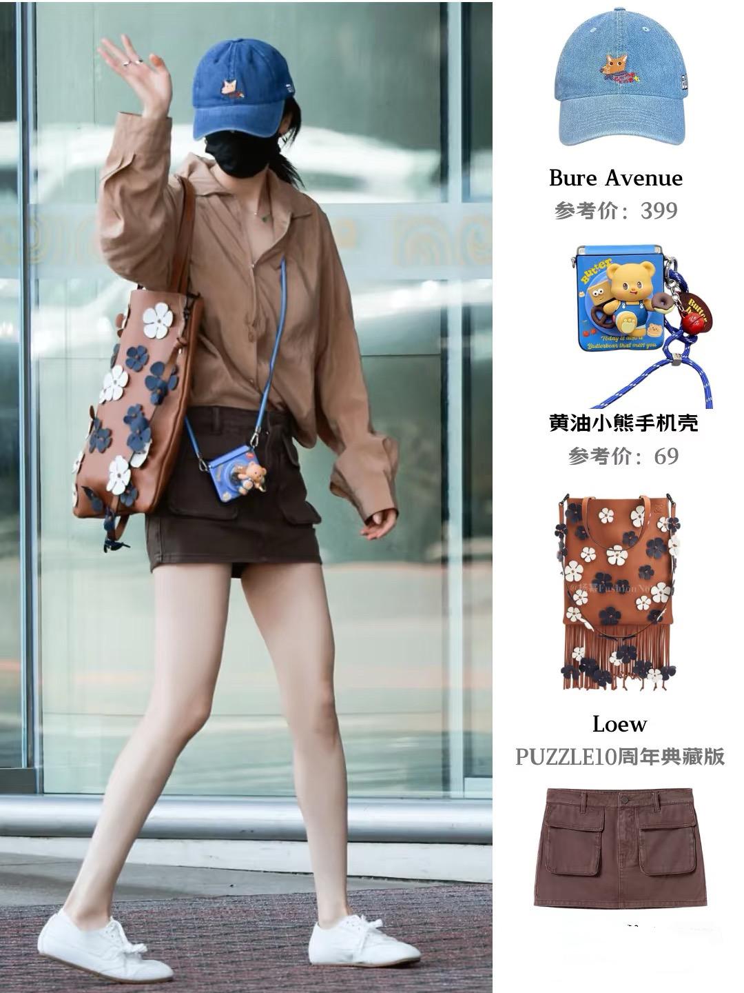 棕色的襯衫、深棕色的短裙,以及帶有花朵裝飾的棕色大包包,讓整體穿搭個性又和諧。可愛的黃油小熊手機殼,狐狸刺繡的牛仔帽,表現着年輕女生的張揚,很清純也很時尚。