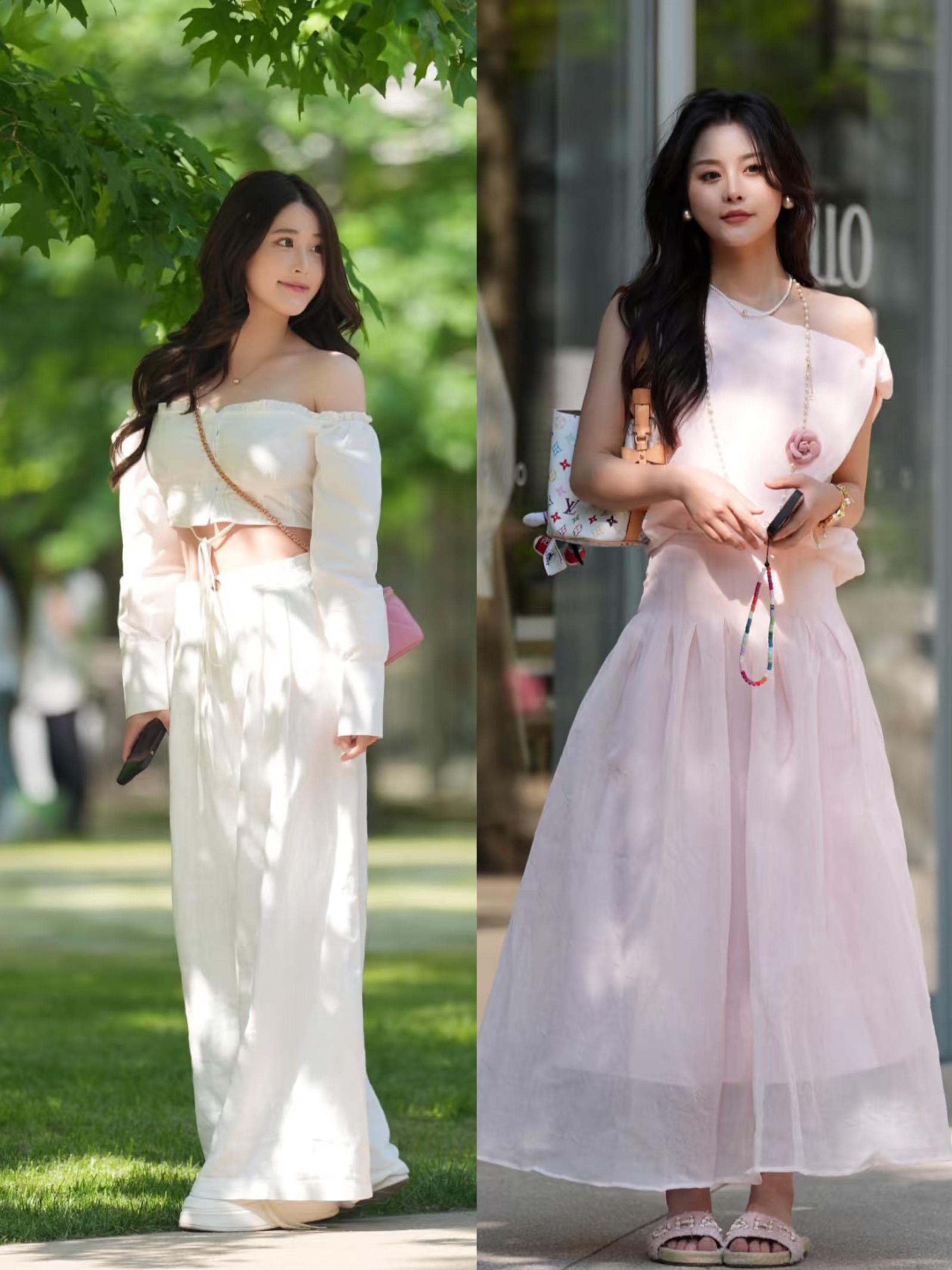 如果想要更加個性一點,就用少許的露肩上衣凹造型。露肩的款式,不誇張、更凸顯出骨感美,這種淺粉色套裝,溫柔又甜美。