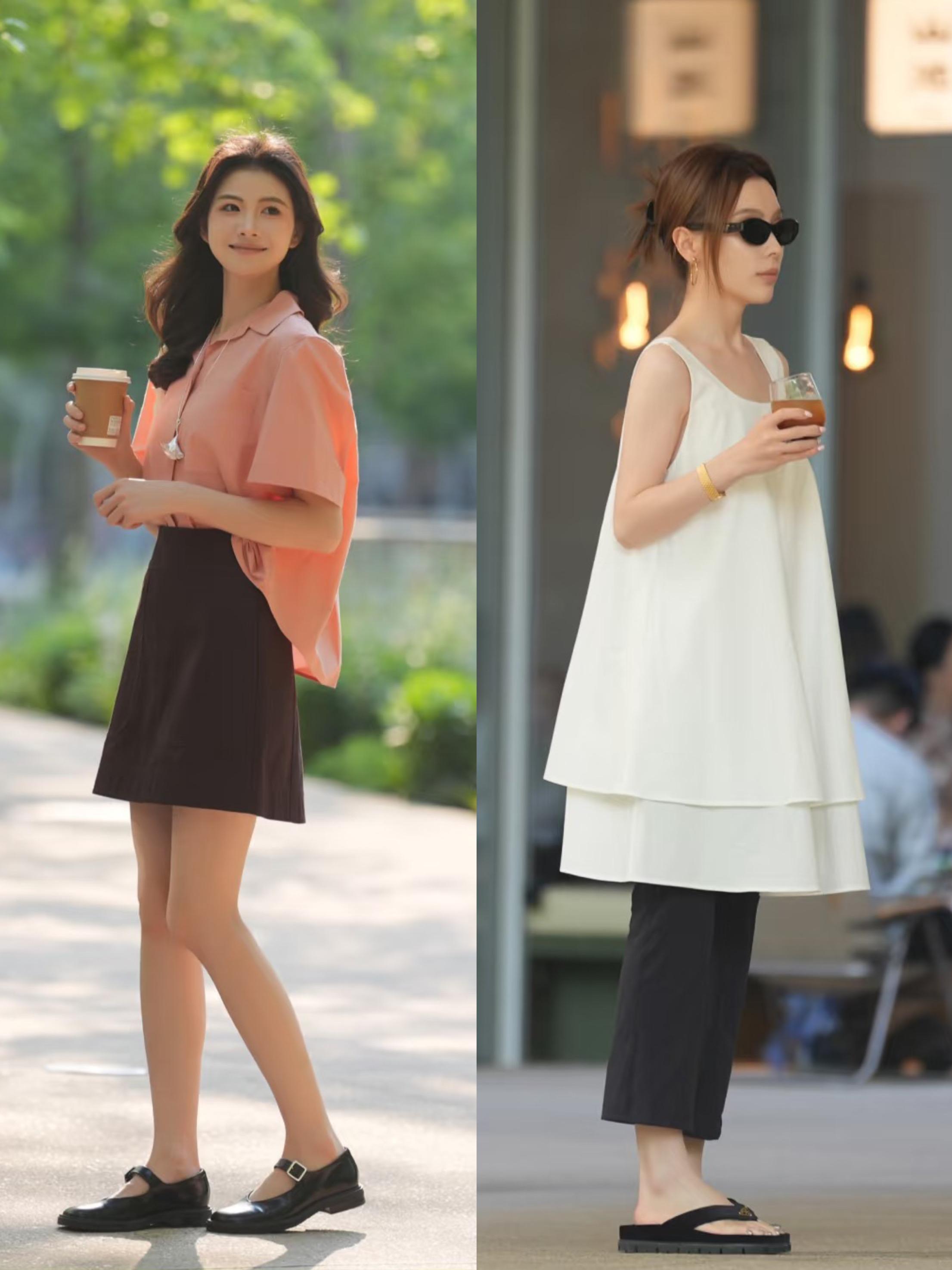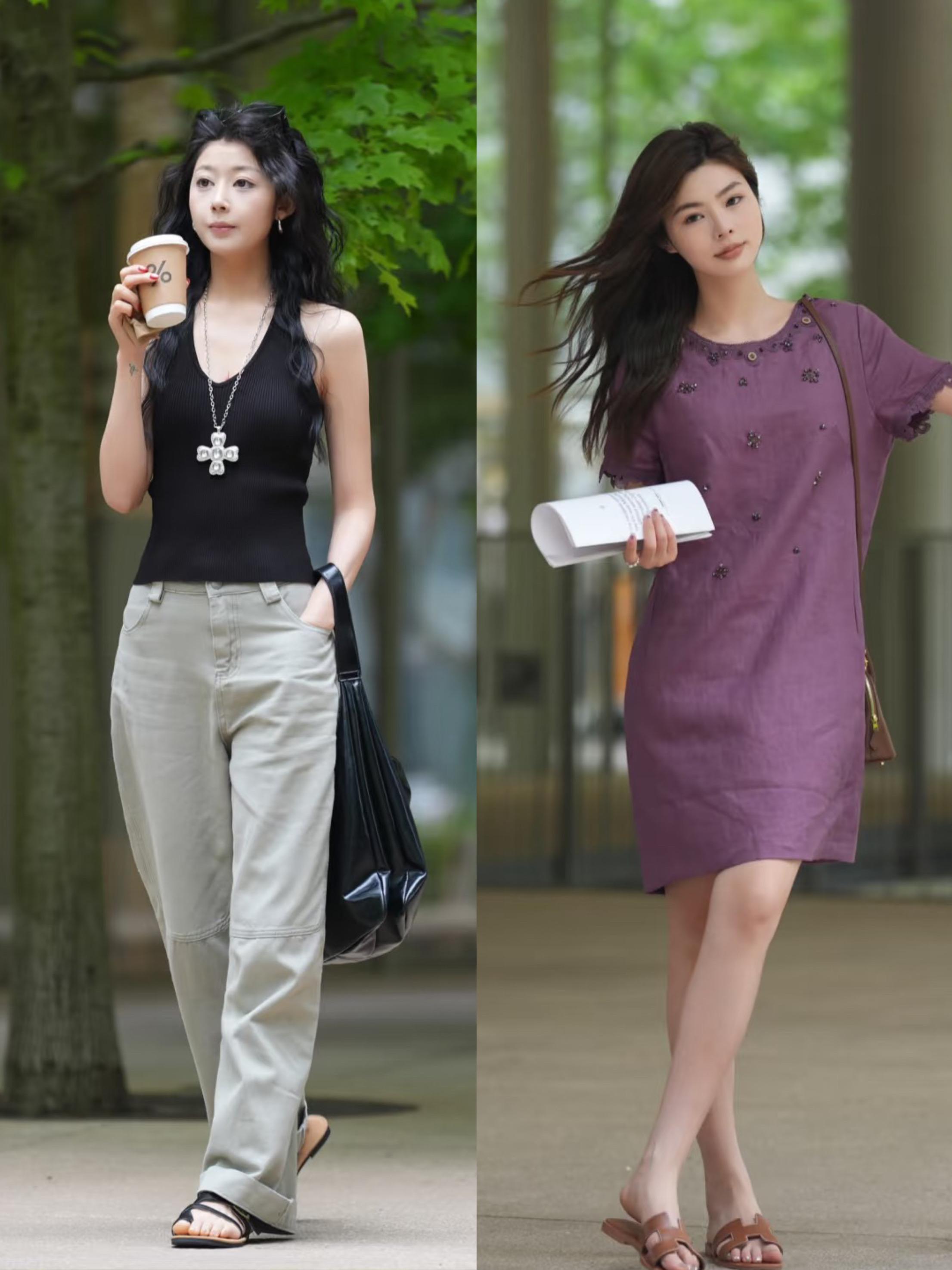 稍微硬挺一點點服裝面料,與基礎款的單品更配。比如襯衫、背心裙,都可以選擇比較挺括的面料。