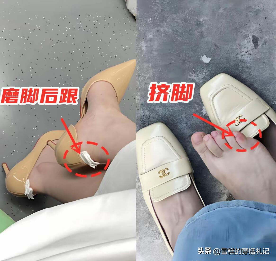 其次,鞋頭位置不能過窄,太窄的鞋頭會出現擠腳的情況,對於很多腳胖、腳寬以及腳弓高的女性很不友好,穿出門根本就不能走長路。