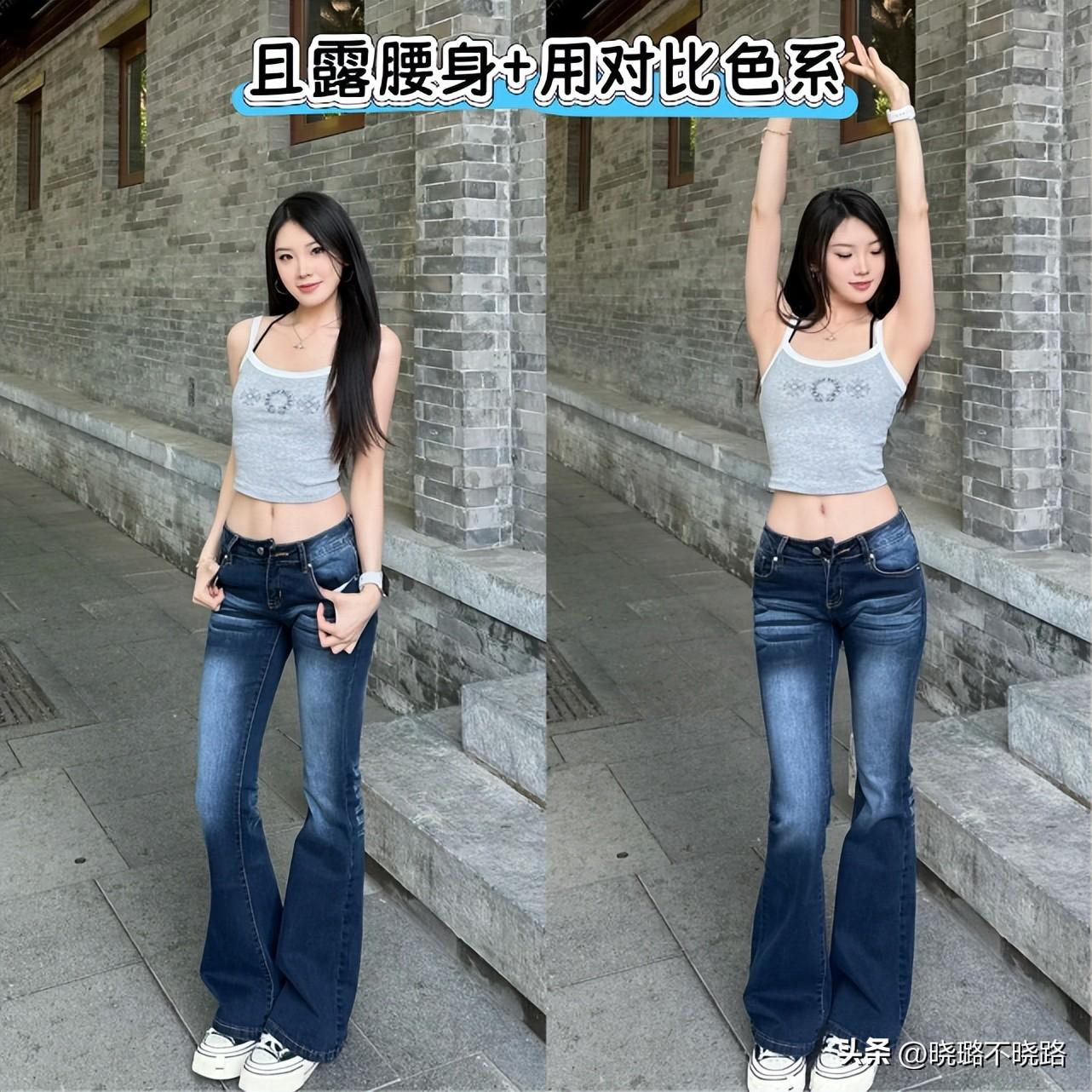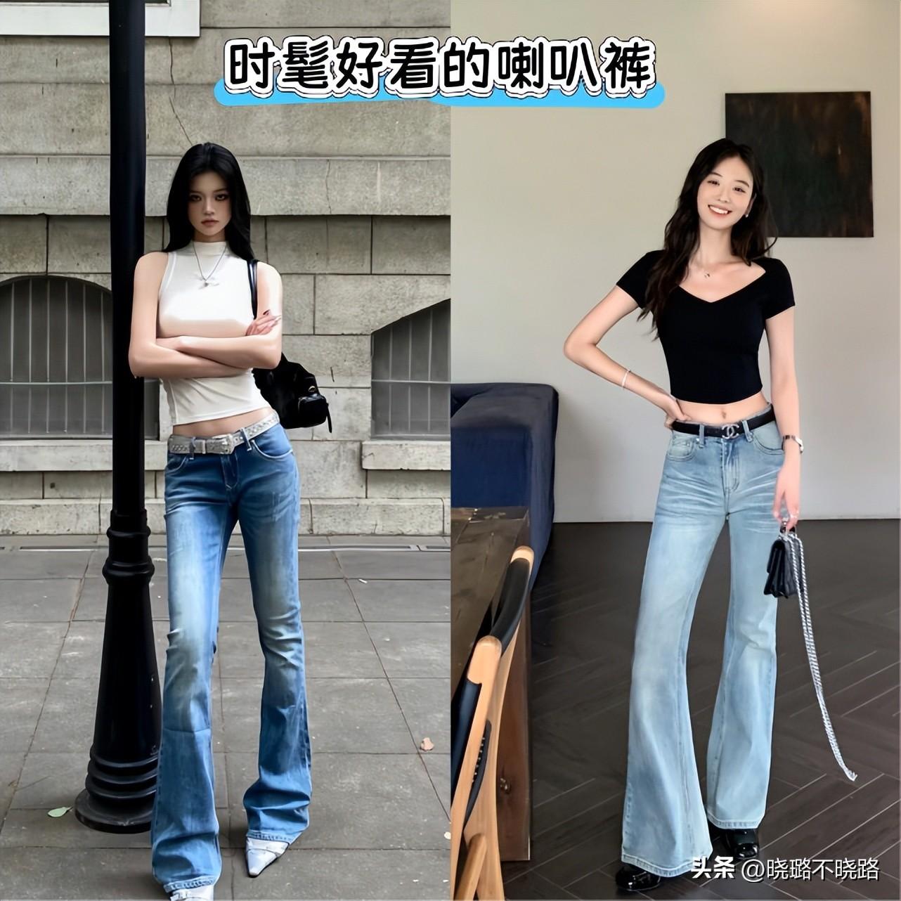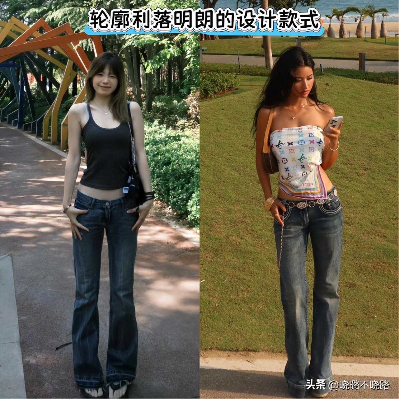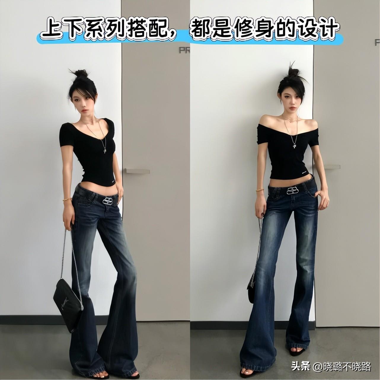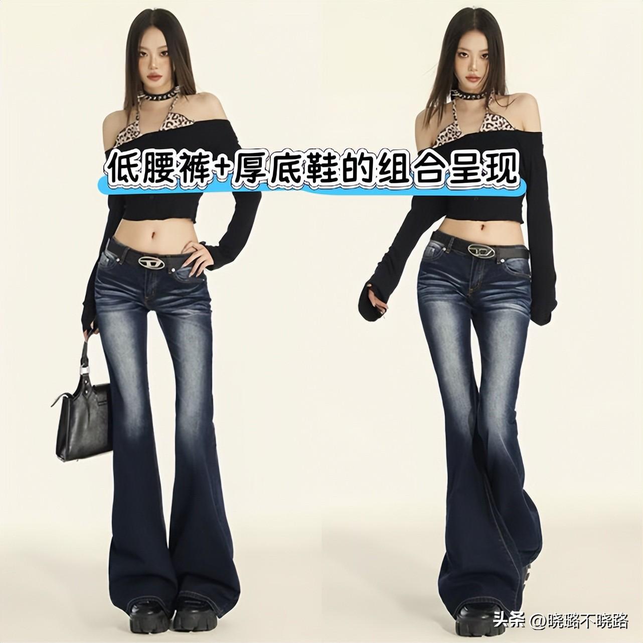 低腰褲的版型在近兩年非常熱門以及搭配頻率比較高的就是低腰款式的喇叭褲,因爲這一款褲型的線條走向有着非常明顯的變化,而且它本身的時髦感就很明顯。如果想要優化我們腿型線條的走向,使其呈現的更加具有美感的話,那麼這樣的款式推薦給大家進行優選。