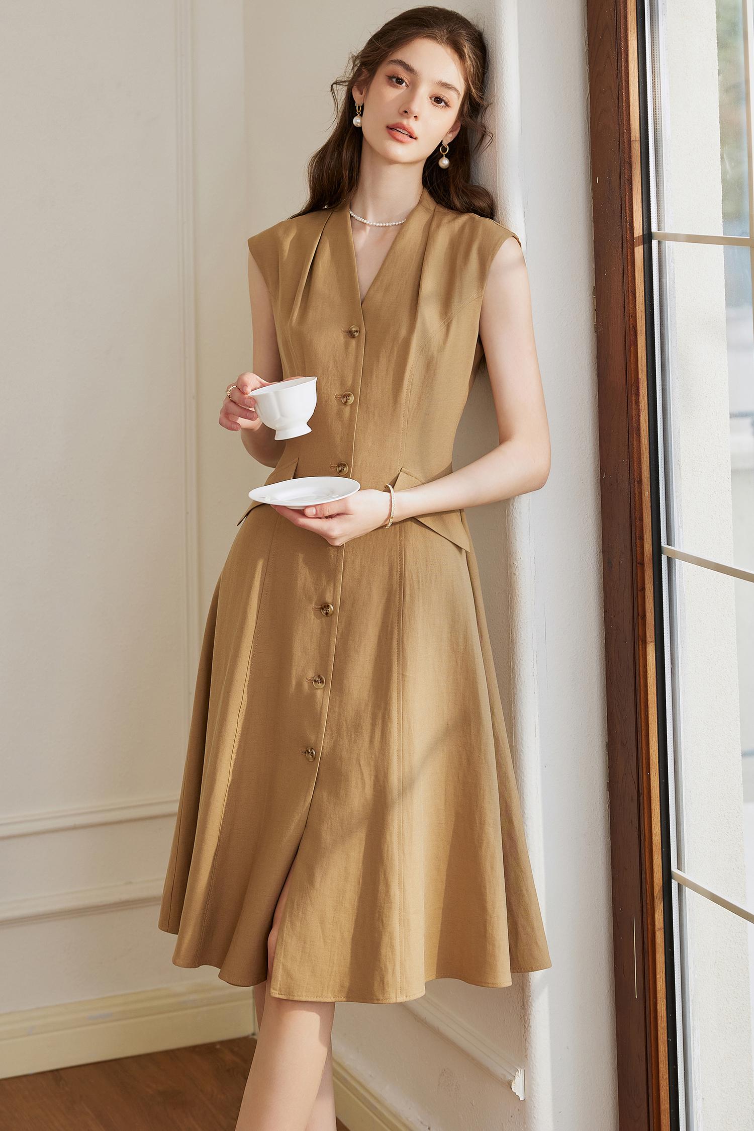 這款卡其色V領連衣裙,非常適合40+小個子!利落剪裁,拉長身形,顯瘦效果一流,完美適配通勤風。流暢線條勾勒幹練氣質,助你輕鬆穿梭職場。簡約不失格調,讓你每天都能自信開啓工作時光。