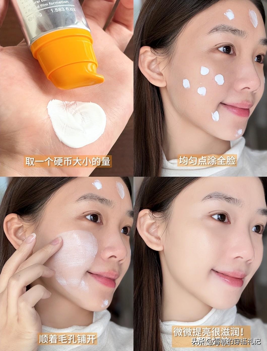 防曬的塗抹可不是塗在臉上越多越好,因爲它是其中的成分在臉上成膜的,所以真的很建議各位塗的時候直接提取一枚硬幣大小的用量,也可以稍微偏多一些,並且分開區域少量多次的進行塗抹哦,這樣的塗抹方法就剛好不浪費且也是最合適的用量了。