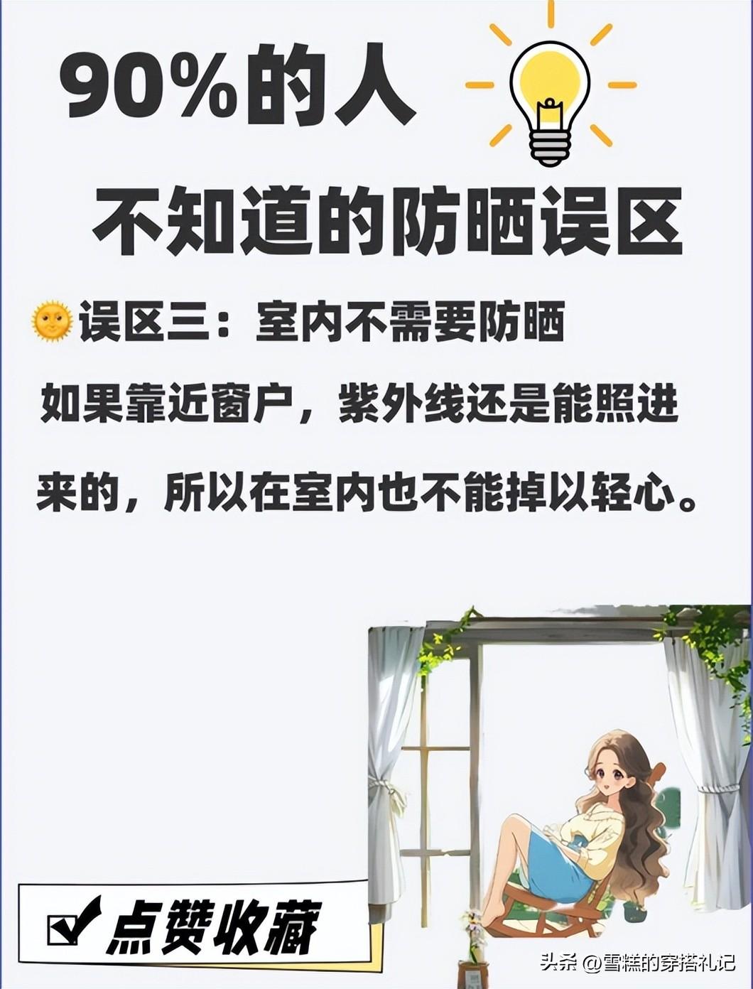 這一個誤區相信絕大多數的女性都有,就是覺得紫外線是在戶外才會有的,所以像日常上班或者是室內活動的時候就不用塗了,其實不然,如若你的辦公位臨近窗邊的話,那麼所受到的紫外線輻射可一點都不比戶外少哦,或者是室內的設計有漏光的部分,也會曬到我們身上損傷肌膚。