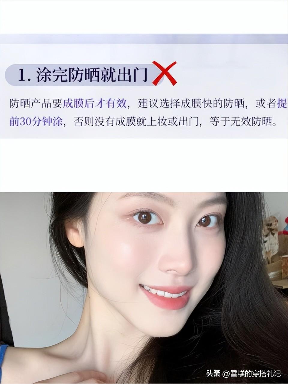 塗防曬的時候第一個很需要注意的點就是不要在出門的時候纔想起來塗抹防曬,因爲防曬產品不是一個即時成膜的材料,需要8--15分鐘的時間在我們的肌膚上逐漸形成一層保護膜,所以還是非常有必要在出門前10-15分鐘就將防曬塗抹的哦,不然塗了防曬就出門等於是無效塗防曬。