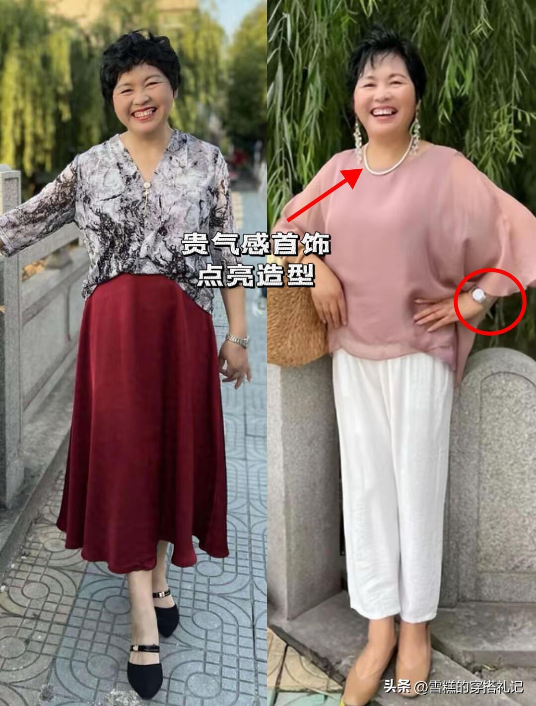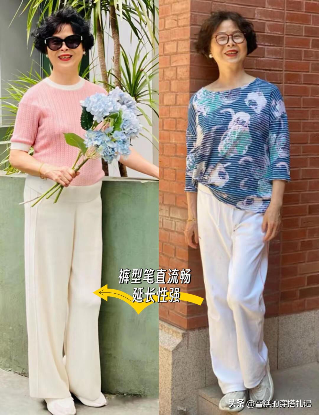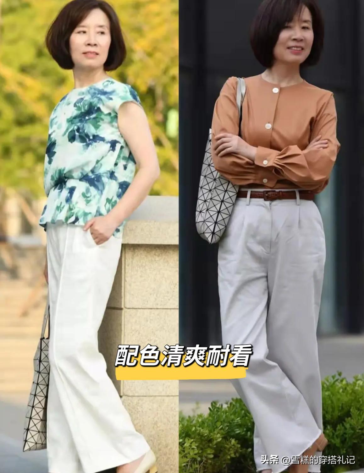 杭州阿姨無論是穿褲還是穿裙,都懂的明示出腰部線條,搭配長褲的時候,上衣會選擇修身款,長度不過胯部,色彩進行對比,就能分割出三七分比例。