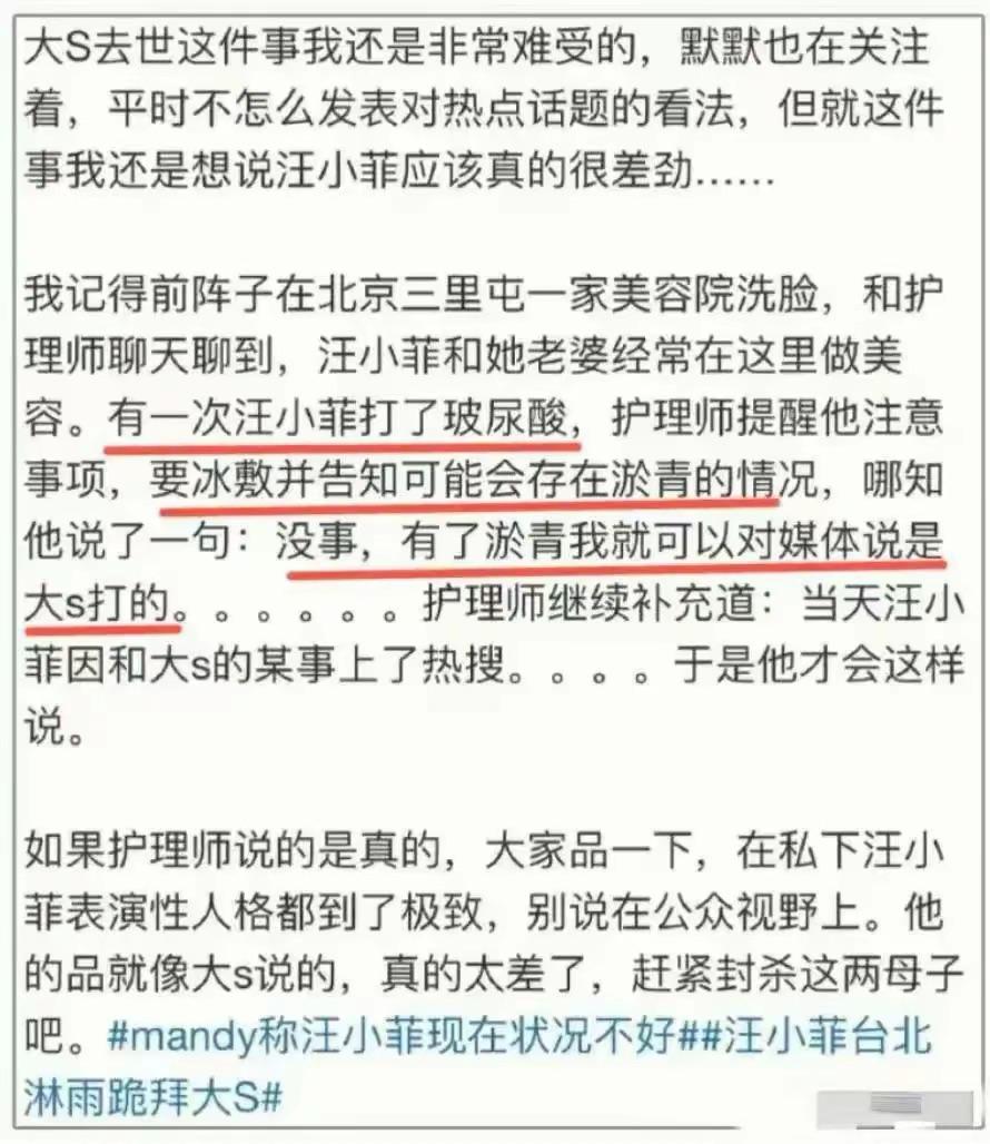 汪小菲到底有多能做戲,你根本想象不到。之前有護理師表示:汪小菲打玻尿酸,讓他注意淤青。他竟然說淤青沒關係,有了淤青就說是大S打的。