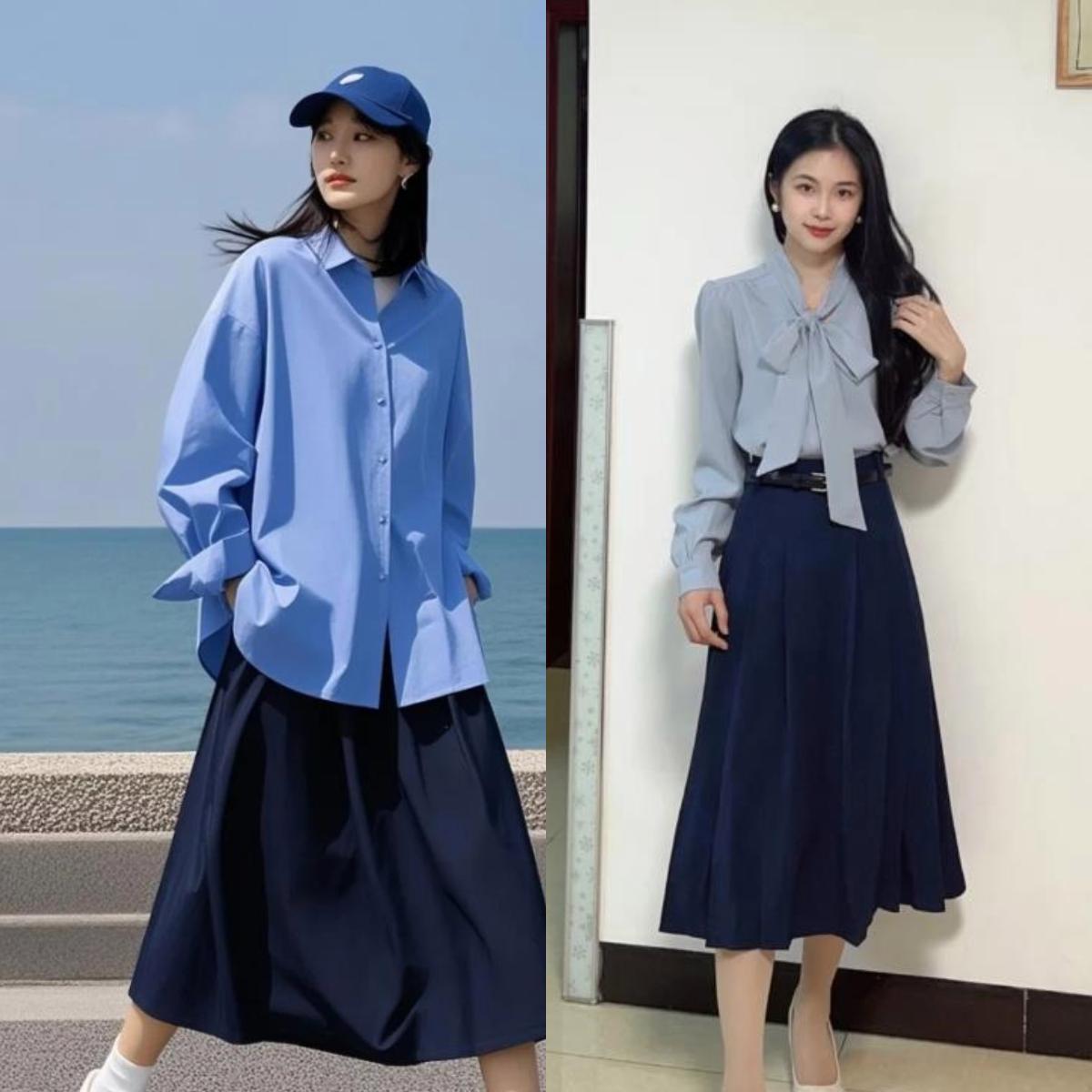 同色系的搭配,是自帶高級感的,霧霾藍襯衫+藏藍色赫本長裙,通過深淺配色進行過渡,盡顯高級感,也不失精緻和溫婉,很迷人。